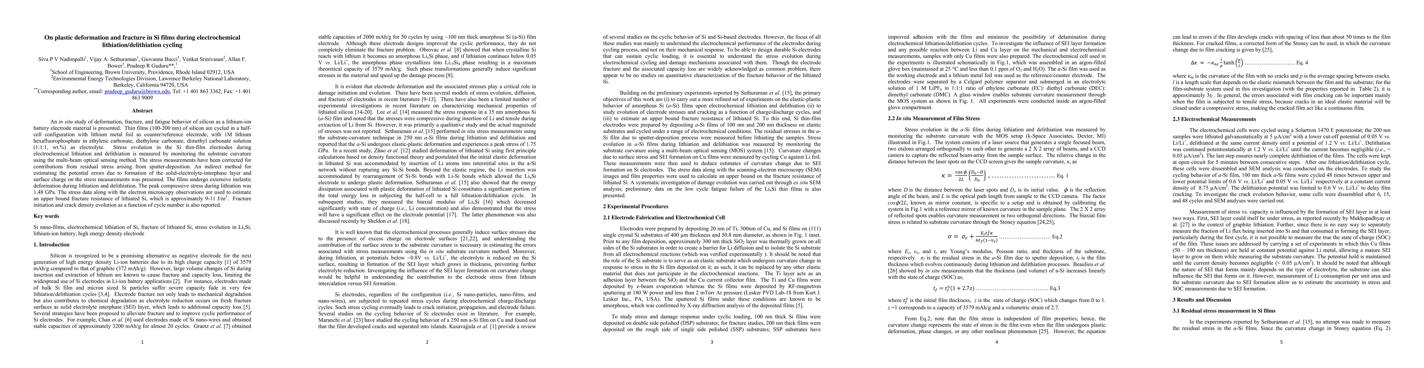 This work distinguishes itself by focusing on stress evolution in thin silicon films during lithiation and delithiation, providing a more comprehensive analysis of plastic deformation and fracture behavior in Si films as battery electrode materials.