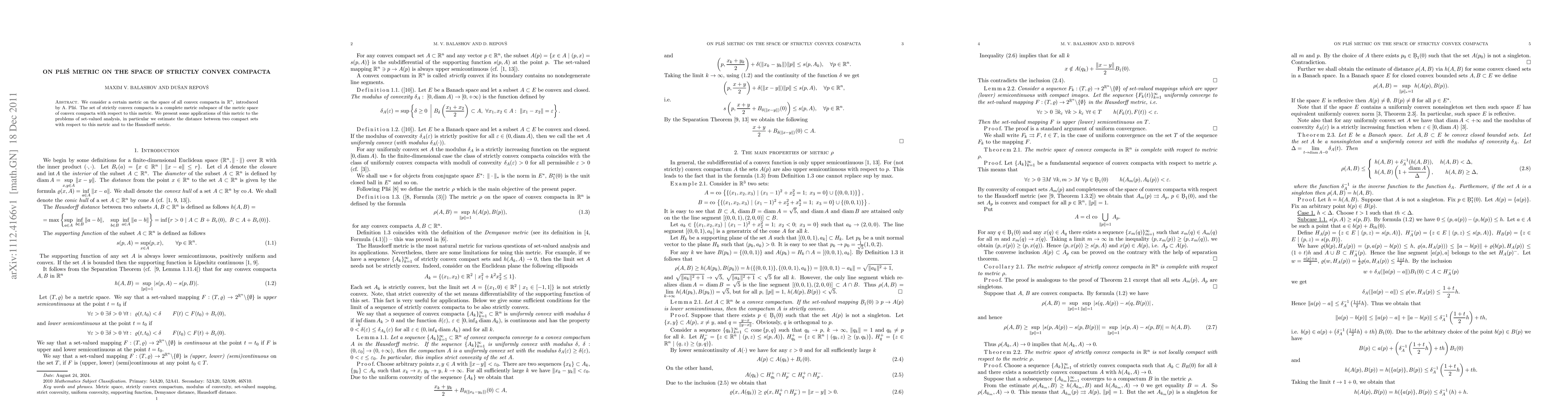 This paper explores Pliś's metric on the space of convex compacta in $\R^{n}$, demonstrating that strictly convex compacta form a complete metric subspace. It also applies this metric to set-valued analysis, estimating distances between compact sets in comparison to the Hausdorff metric.