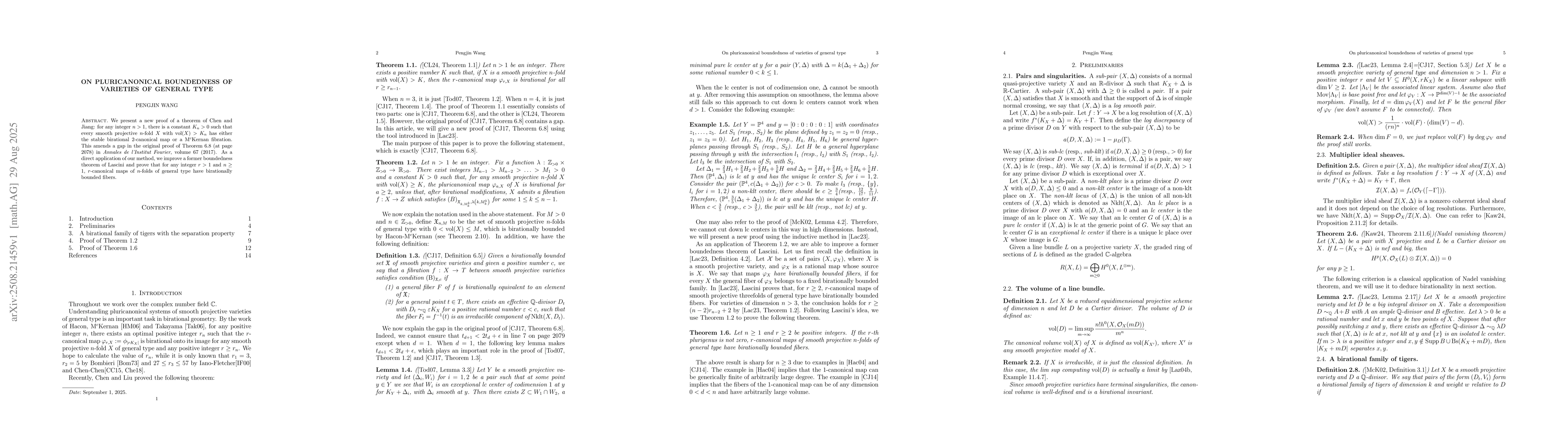 We present a new proof of a theorem of Chen and Jiang: for any integer $n>1$, there is a constant $K_n>0$ such that every smooth projective $n$-fold $X$ with $\operatorname{vol}(X)>K_n$ has either the stable birational $2$-canonical map or a M$^c$Kernan fibration. This amends a gap in the original proof of Theorem 6.8 (at page 2078) in Annales de l'Institut Fourier, volume 67 (2017). As a direct application of our method, we improve a former boundedness theorem of Lacini and prove that for any integer $r>1$ and $n\geq 1$, $r$-canonical maps of $n$-folds of general type have birationally bounded fibers.