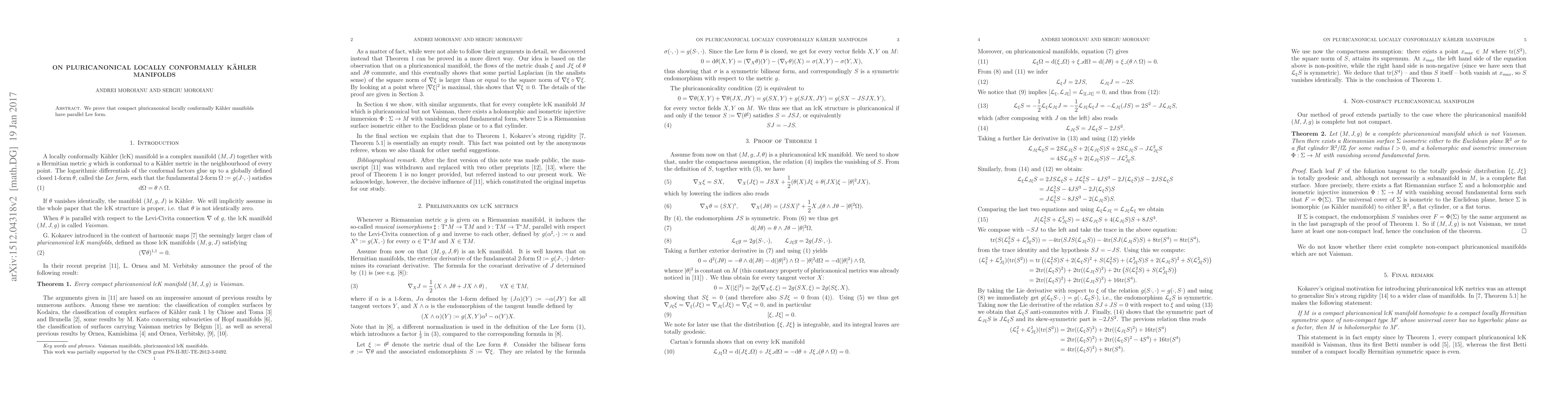 Summary: The paper presents a concise proof demonstrating that compact pluricanonical locally conformally Kähler manifolds possess a parallel Lee form. This finding reinforces the geometric structure of these special manifolds.