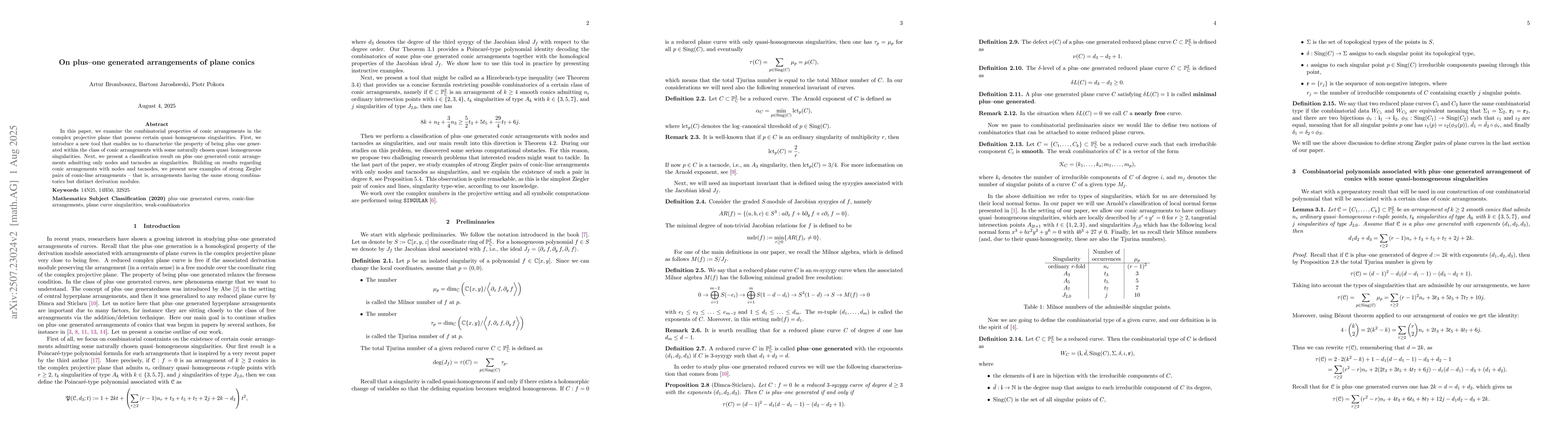 In this paper, we examine the combinatorial properties of conic arrangements in the complex projective plane that possess certain quasi--homogeneous singularities. First, we introduce a new tool that enables us to characterize the property of being plus--one generated within the class of conic arrangements with some naturally chosen quasi--homogeneous singularities. Next, we present a classification result on plus--one generated conic arrangements admitting only nodes and tacnodes as singularities. Building on results regarding conic arrangements with nodes and tacnodes, we present new examples of strong Ziegler pairs of conic-line arrangements -- that is, arrangements having the same strong combinatorics but distinct derivation modules.