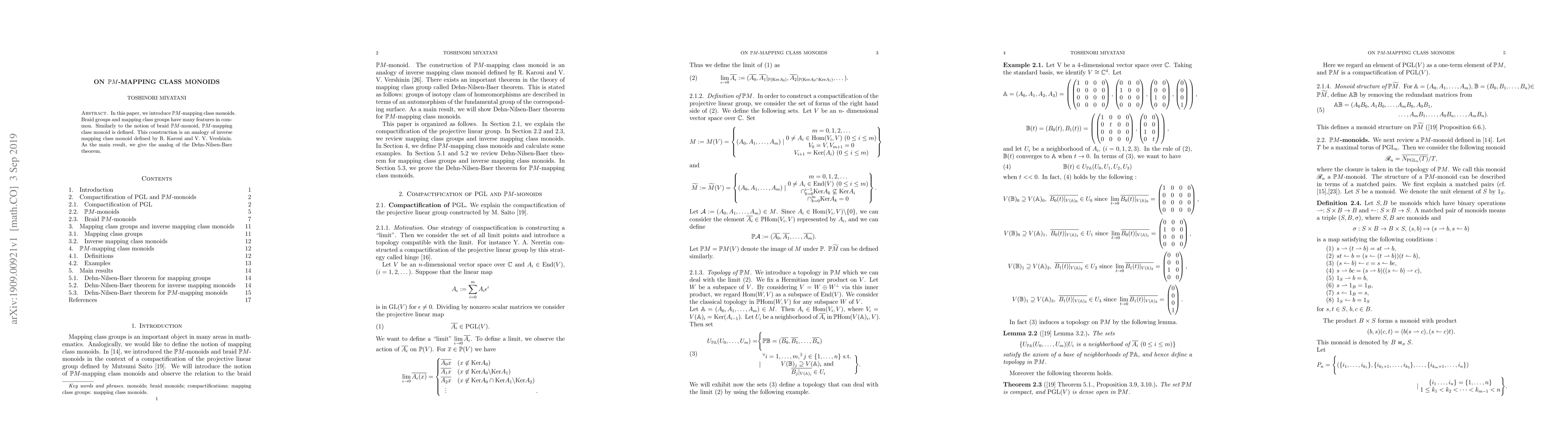 In this paper, we introduce PM-mapping class monoids. Braid groups and mapping class groups have many features in common. Similarly to the notion of braid PM-monoid, PM-mapping class monoid is defined. This construction is an analogy of inverse mapping class monoid defined by R. Karoui and V. V. Vershinin. As the main result, we give the analog of the Dehn-Nilsen-Baer theorem.