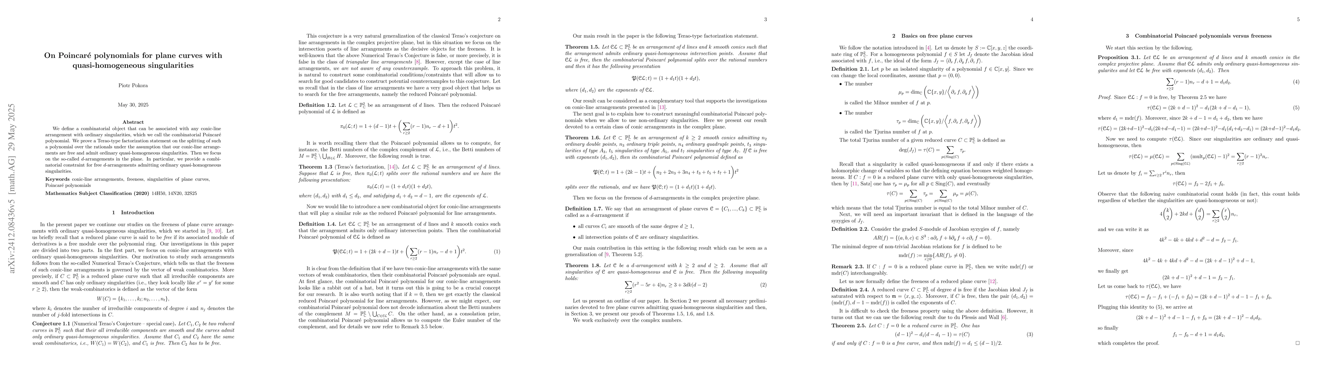 Summary: The paper introduces a combinatorial Poincar\'e polynomial for conic-line arrangements with ordinary quasi-homogeneous singularities, proving a Terao-type factorization. It also presents a combinatorial constraint for free $d$-arrangements with these singularities.