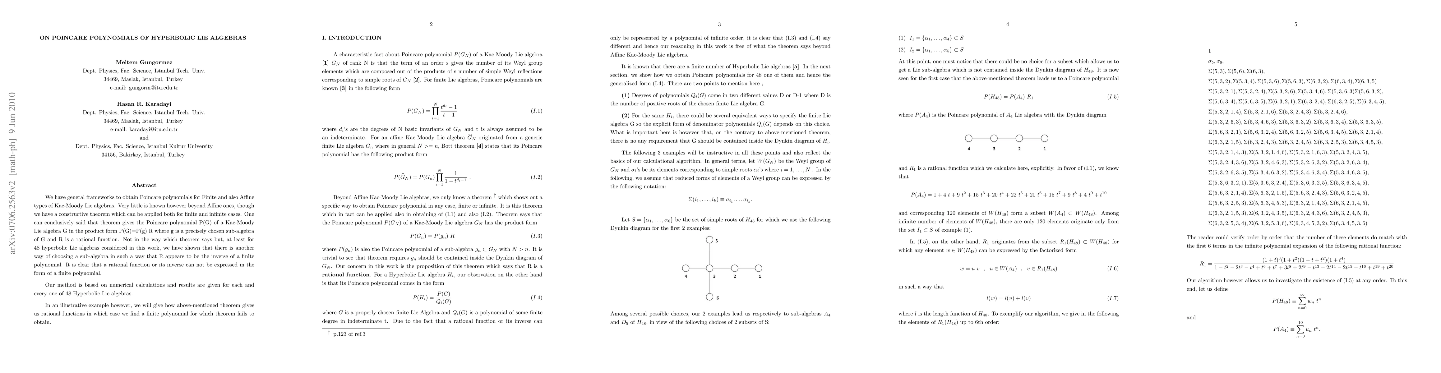 This paper presents a constructive theorem to obtain Poincare polynomials for Kac-Moody Lie algebras, showing that for 48 hyperbolic Lie algebras, the sub-algebra choice allows for R to be the inverse of a finite polynomial. Numerical calculations were used to derive results for each algebra, demonstrating a departure from the theorem's rational function form in some cases.