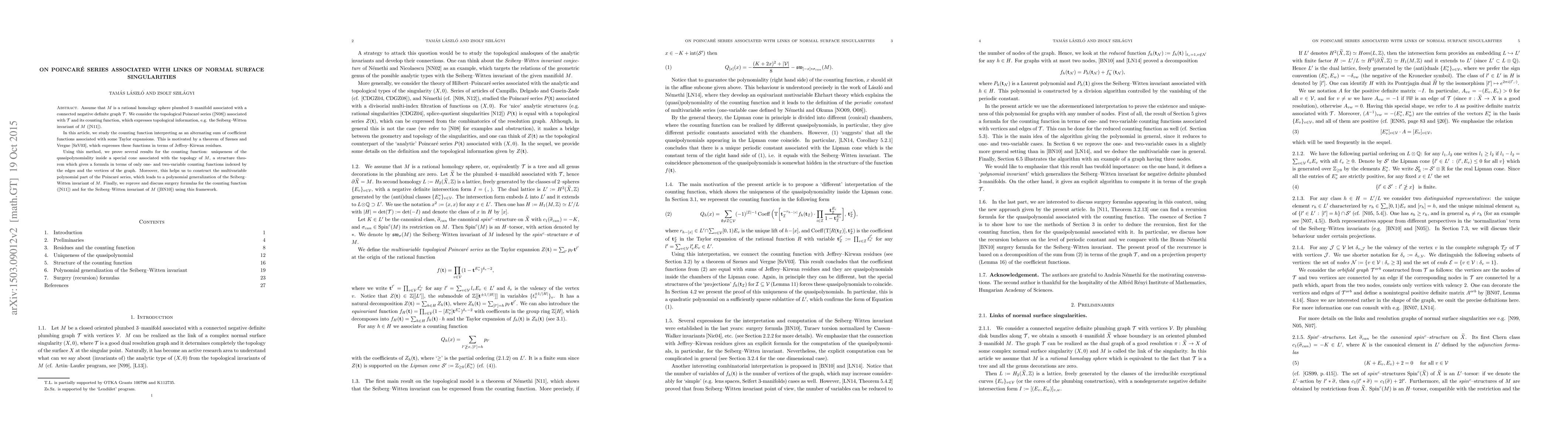 This paper explores the topological Poincaré series linked to the singularities of normal surfaces, proving the uniqueness of quasipolynomiality within a special cone. It utilizes Jeffrey-Kirwan residues to interpret these series and discusses surgery formulas related to the Seiberg-Witten invariant.