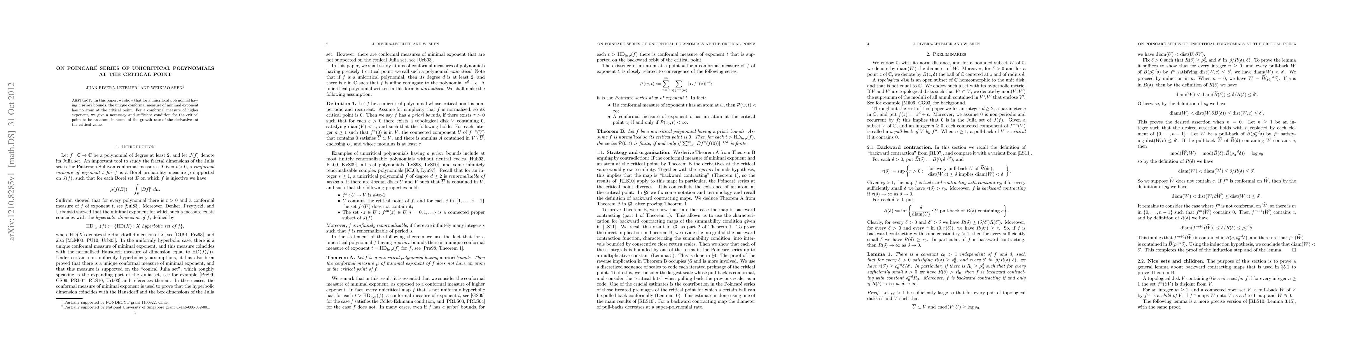 This paper demonstrates that for unicritical polynomials with specified bounds, the conformal measure of minimal exponent lacks atoms at the critical point. It also provides a necessary and sufficient condition for higher exponent conformal measures to have atoms at the critical point, based on the growth rate of derivatives at the critical value.