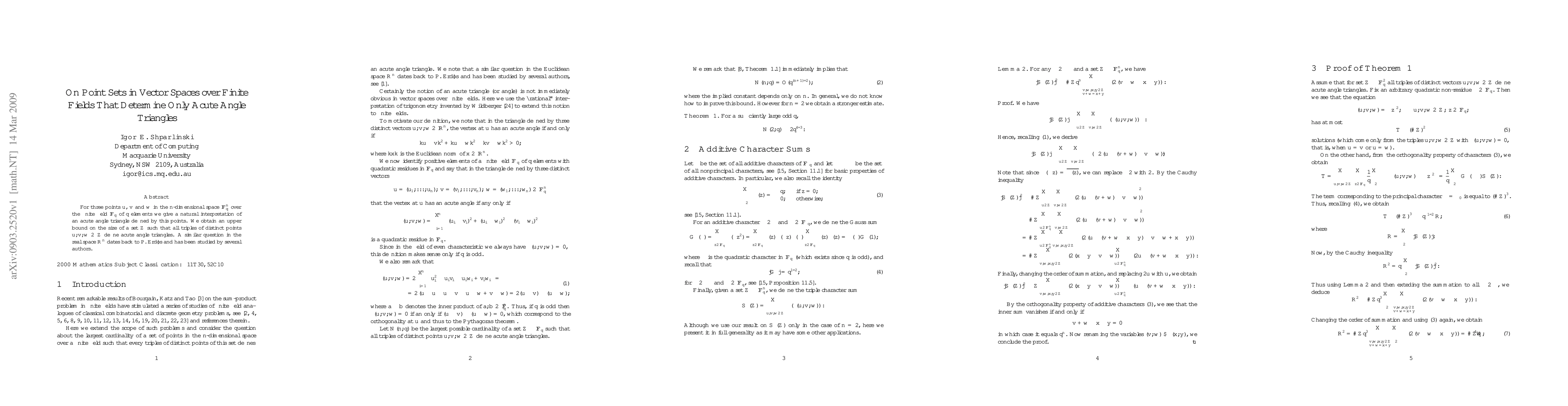 For three points $\vec{u}$,$\vec{v}$ and $\vec{w}$ in the $n$-dimensional space $\F_q^n$ over the finite field $\F_q$ of $q$ elements we give a natural interpretation of an acute angle triangle defined by this points. We obtain an upper bound on the size of a set $\cZ$ such that all triples of distinct points $\vec{u}, \vec{v}, \vec{w} \in \cZ$ define acute angle triangles. A similar question in the real space $\cR^n$ dates back to P. Erd{\H o}s and has been studied by several authors.