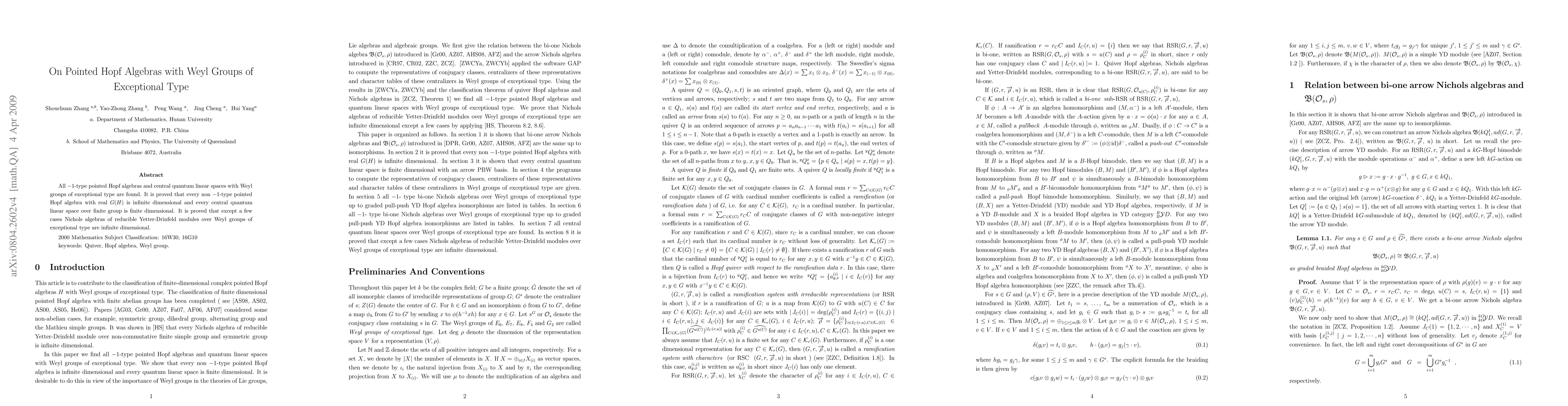 Summary: This paper identifies all -1-type pointed Hopf algebras and central quantum linear spaces associated with exceptional type Weyl groups, proving that non -1-type pointed Hopf algebras are infinite dimensional, while central quantum linear spaces over finite groups are finite dimensional. It also shows that most Nichols algebras of reducible Yetter-Drinfeld modules in these contexts are infinite dimensional, except for a few cases.
