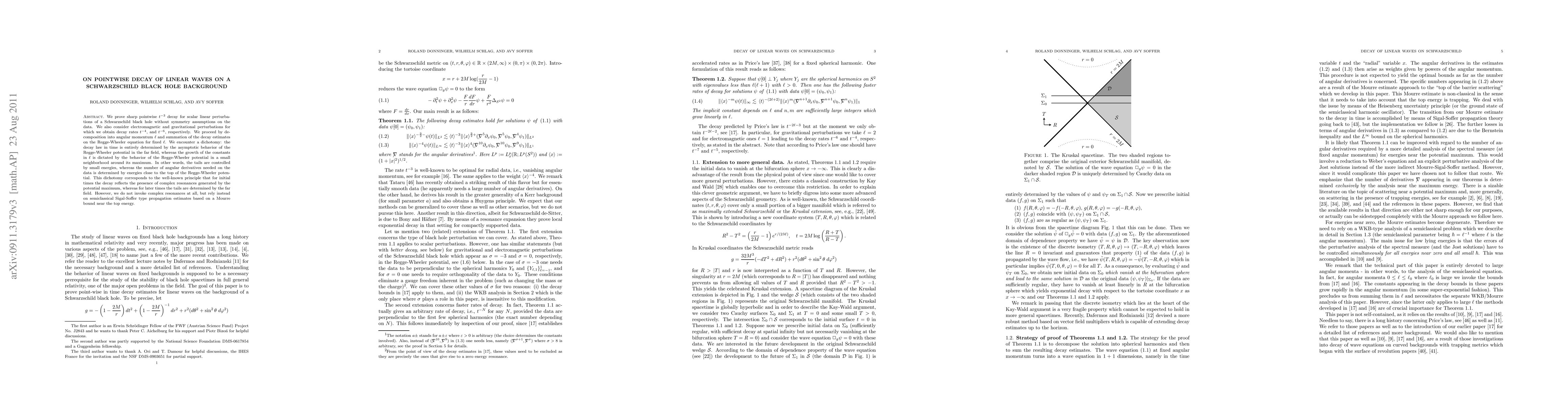 We prove sharp pointwise $t^{-3}$ decay for scalar linear perturbations of a Schwarzschild black hole without symmetry assumptions on the data. We also consider electromagnetic and gravitational perturbations for which we obtain decay rates $t^{-4}$, and $t^{-6}$, respectively. We proceed by decomposition into angular momentum $\ell$ and summation of the decay estimates on the Regge-Wheeler equation for fixed $\ell$. We encounter a dichotomy: the decay law in time is entirely determined by the asymptotic behavior of the Regge-Wheeler potential in the far field, whereas the growth of the constants in $\ell$ is dictated by the behavior of the Regge-Wheeler potential in a small neighborhood around its maximum. In other words, the tails are controlled by small energies, whereas the number of angular derivatives needed on the data is determined by energies close to the top of the Regge-Wheeler potential. This dichotomy corresponds to the well-known principle that for initial times the decay reflects the presence of complex resonances generated by the potential maximum, whereas for later times the tails are determined by the far field. However, we do not invoke complex resonances at all, but rely instead on semiclassical Sigal-Soffer type propagation estimates based on a Mourre bound near the top energy.
