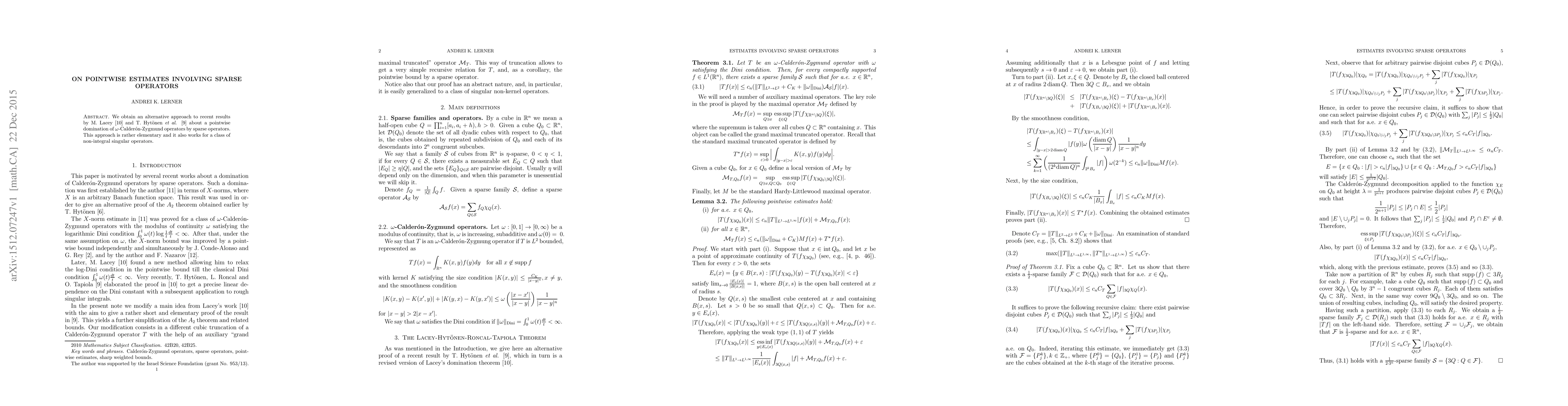 We obtain an alternative approach to recent results by M. Lacey \cite{La} and T. Hyt\"onen {\it et al.} \cite{HRT} about a pointwise domination of $\omega$-Calder\'on-Zygmund operators by sparse operators. This approach is rather elementary and it also works for a class of non-integral singular operators.