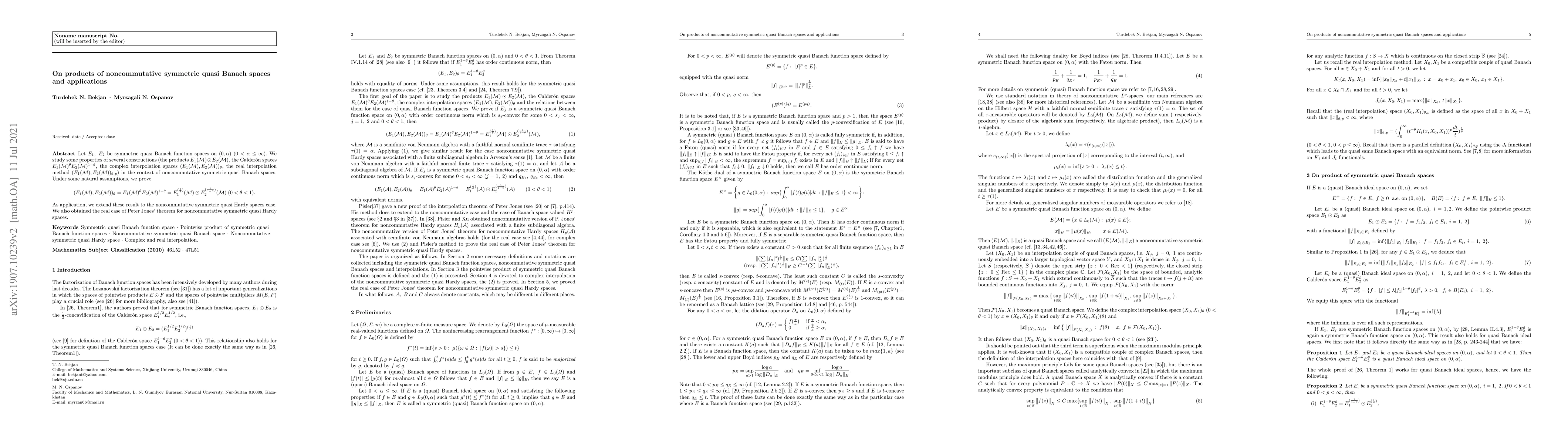 This paper investigates various constructions of products of symmetric quasi Banach spaces on noncommutative settings, proving equivalences under certain conditions. It extends these results to noncommutative symmetric quasi Hardy spaces and establishes the real case of Peter Jones' theorem in this context.