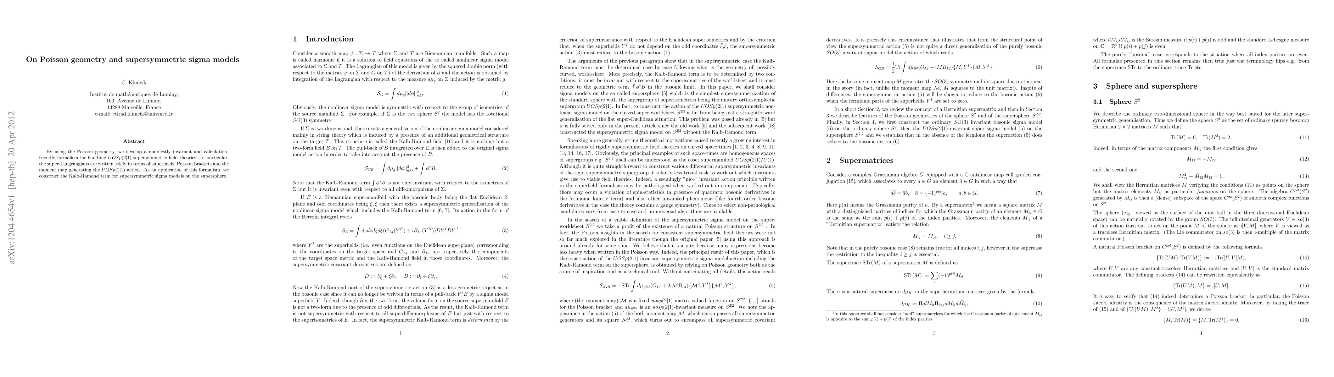 This paper develops a Poisson geometry-based formalism for $UOSp(2|1)$-supersymmetric field theories, utilizing superfields and Poisson brackets. It applies this formalism to construct the Kalb-Ramond term for supersymmetric sigma models on the supersphere.