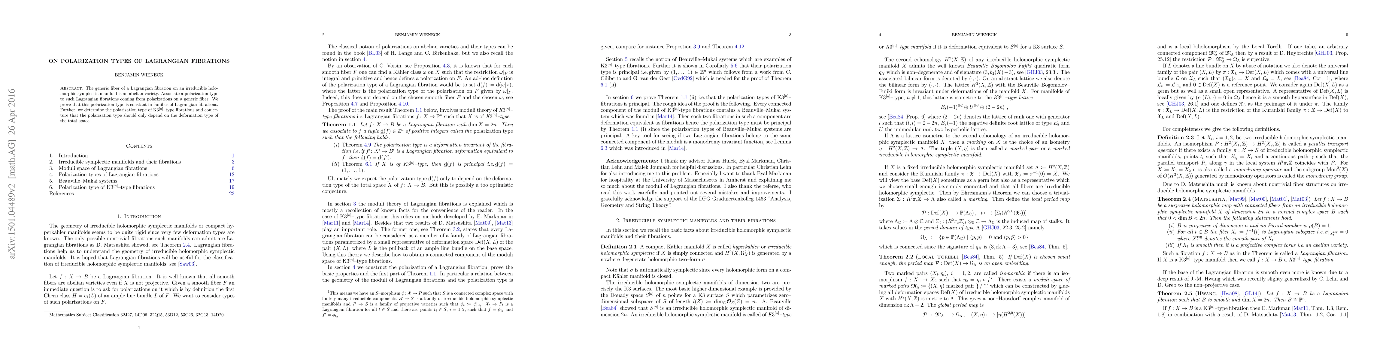 This paper studies Lagrangian fibrations on irreducible holomorphic symplectic manifolds, showing that their generic fibers are abelian varieties with a constant polarization type across families. It also determines the polarization type for K3^[n]-type fibrations and conjectures that this type depends solely on the deformation type of the total space.