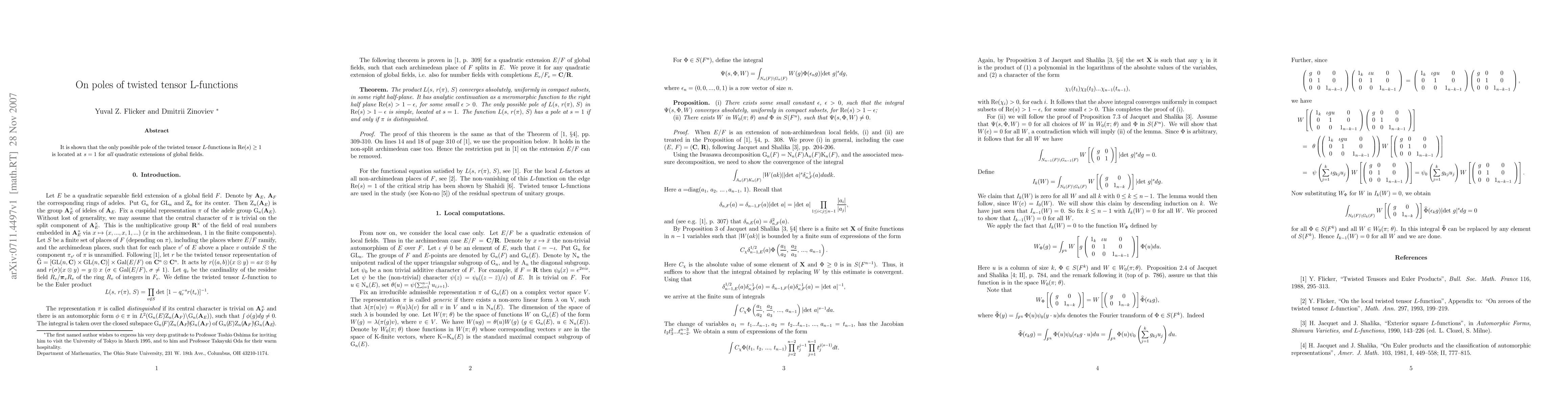 It is shown that the only possible pole of the twisted tensor L-functions in Re(s)\geq 1 is located at s=1 for all quadratic extensions of global fields.