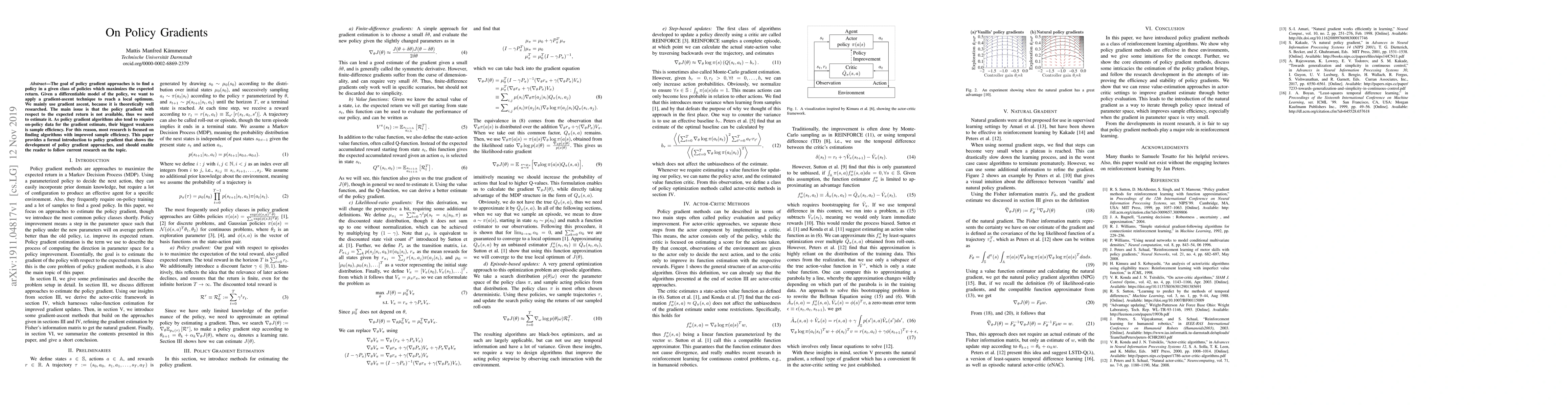 The goal of policy gradient approaches is to find a policy in a given class of policies which maximizes the expected return. Given a differentiable model of the policy, we want to apply a gradient-ascent technique to reach a local optimum. We mainly use gradient ascent, because it is theoretically well researched. The main issue is that the policy gradient with respect to the expected return is not available, thus we need to estimate it. As policy gradient algorithms also tend to require on-policy data for the gradient estimate, their biggest weakness is sample efficiency. For this reason, most research is focused on finding algorithms with improved sample efficiency. This paper provides a formal introduction to policy gradient that shows the development of policy gradient approaches, and should enable the reader to follow current research on the topic.