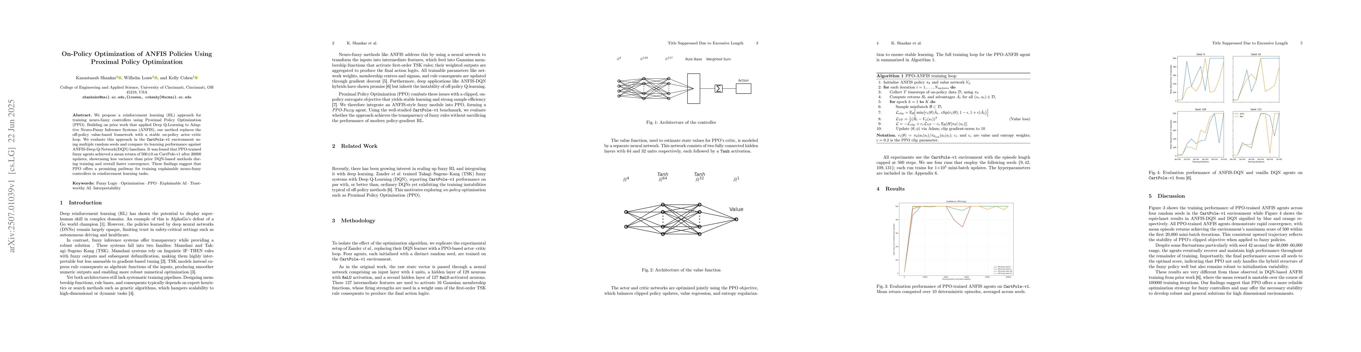 We propose a reinforcement learning (RL) approach for training neuro-fuzzy controllers using Proximal Policy Optimization (PPO). Building on prior work that applied Deep Q-Learning to Adaptive Neuro-Fuzzy Inference Systems (ANFIS), our method replaces the off-policy value-based framework with a stable on-policy actor-critic loop. We evaluate this approach in the CartPole-v1 environment using multiple random seeds and compare its learning performance against ANFIS-Deep Q-Network (DQN) baselines. It was found that PPO-trained fuzzy agents achieved a mean return of 500 +/- 0 on CartPole-v1 after 20000 updates, showcasing less variance than prior DQN-based methods during training and overall faster convergence. These findings suggest that PPO offers a promising pathway for training explainable neuro-fuzzy controllers in reinforcement learning tasks.