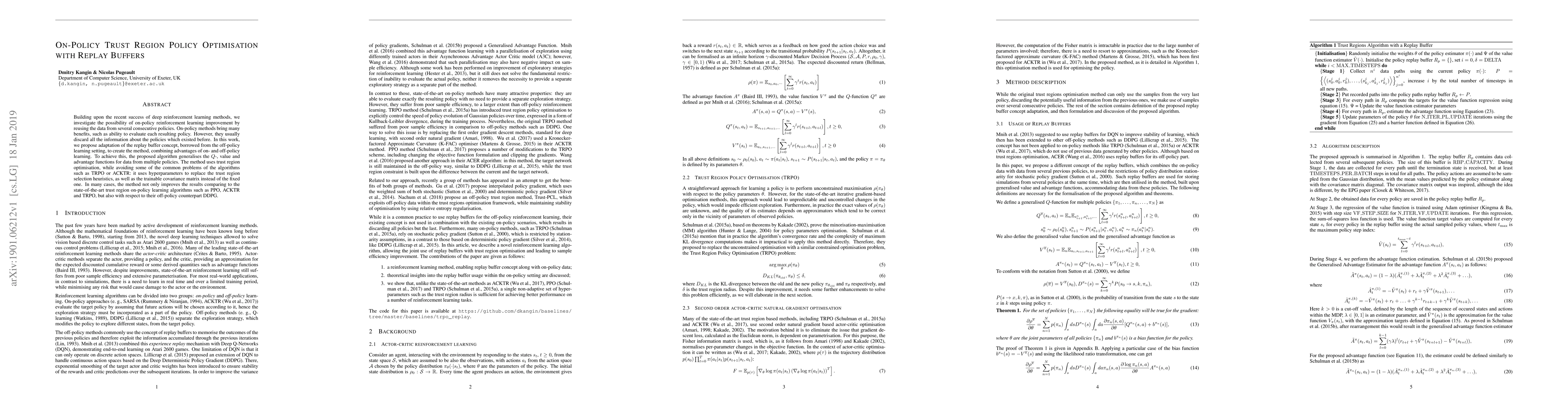 This paper proposes an on-policy reinforcement learning method that leverages replay buffers to reuse data from multiple policies, combining the advantages of both on- and off-policy learning. The method uses trust region optimization and hyperparameters to improve performance over existing on-policy algorithms like PPO and TRPO, while also outperforming off-policy methods like DDPG.