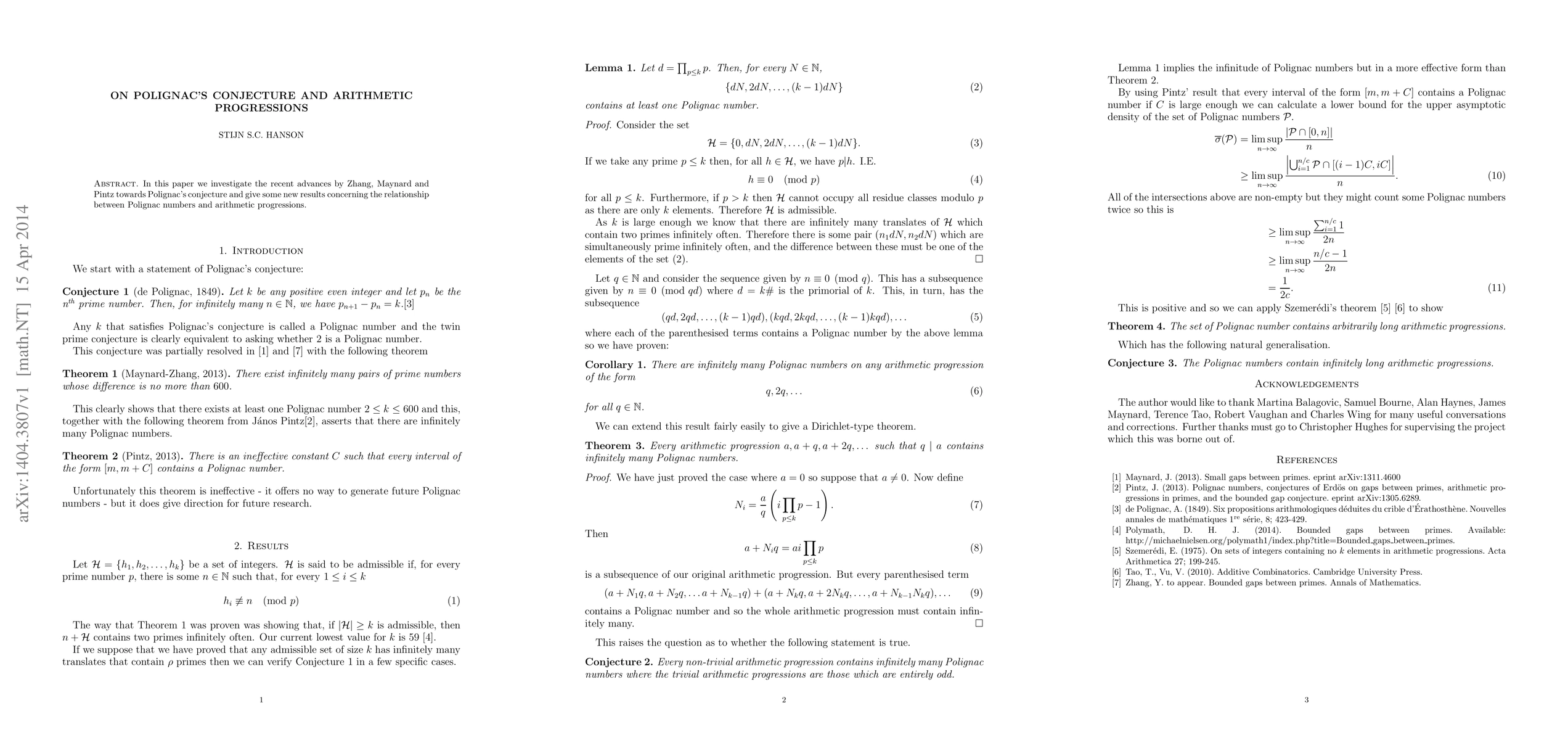 Summary: This paper explores recent progress on Polignac's conjecture, particularly advances by Zhang, Maynard, and Pintz, and presents new findings regarding the connection between Polignac numbers and arithmetic progressions.