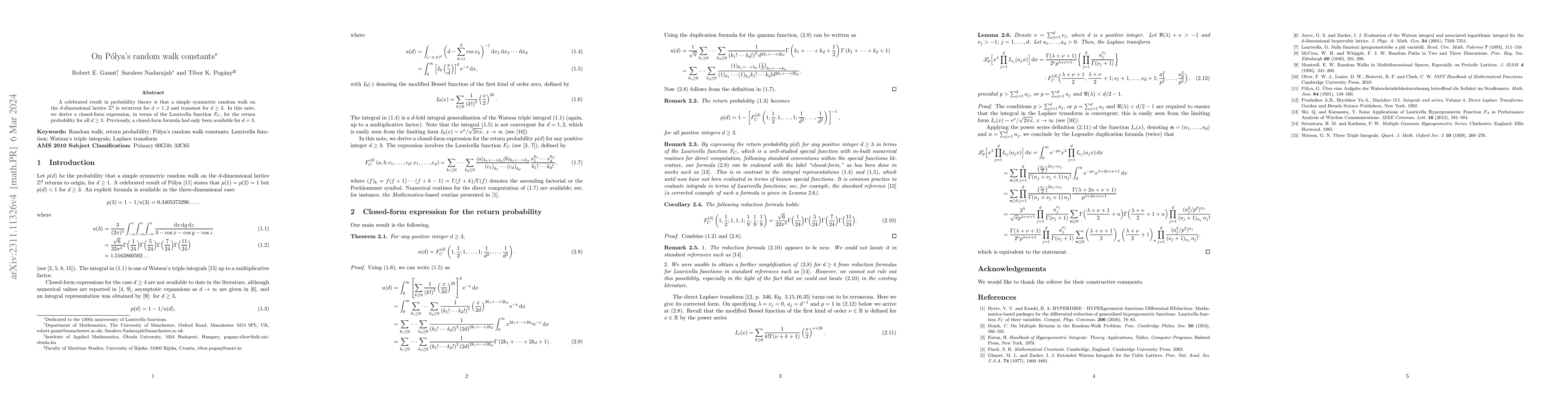 A celebrated result in probability theory is that a simple symmetric random walk on the $d$-dimensional lattice $\mathbb{Z}^d$ is recurrent for $d=1,2$ and transient for $d\geq 3$. In this note, we derive a closed-form expression, in terms of the Lauricella function $F_C$, for the return probability for all $d\geq3$. Previously, a closed-form formula had only been available for $d=3$.