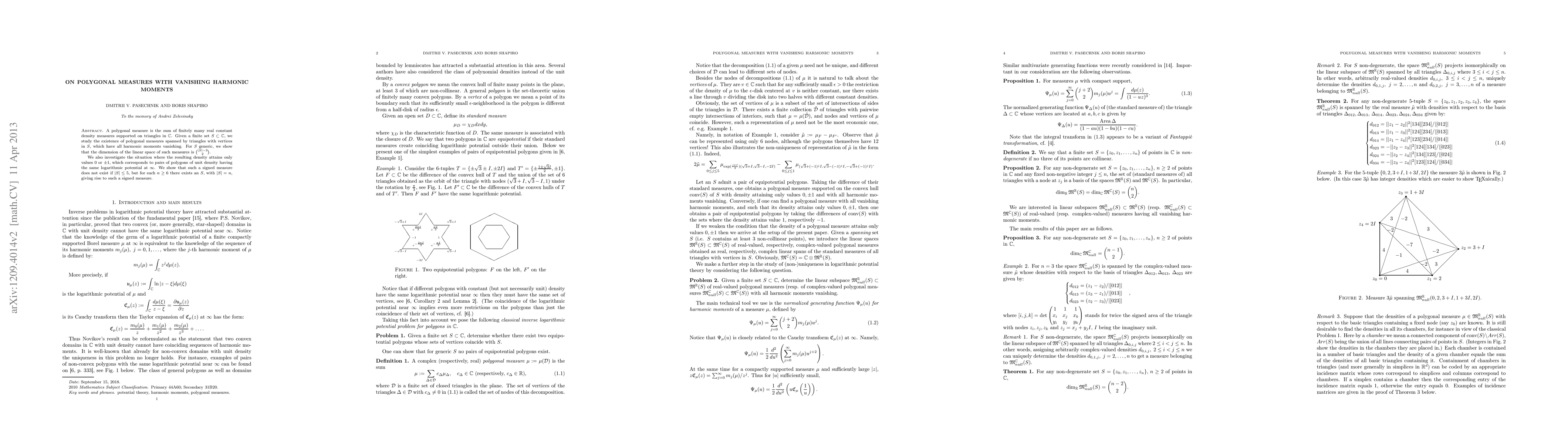 This paper explores signed polygonal measures formed by polygons with vertices in a given set S, focusing on those with vanishing harmonic moments. It finds that for generic S, the dimension of such measures is (|S|-3)(|S|-4)/2, and proves that no such measure exists for |S| ≤ 5, but for |S| ≥ 6, such measures can exist.