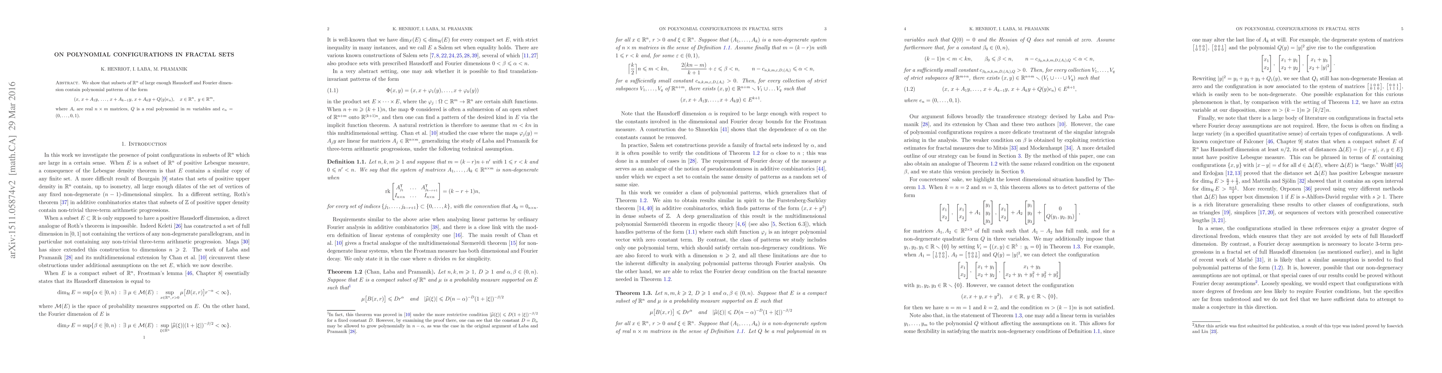 We show that subsets of $\mathbb{R}^n$ of large enough Hausdorff and Fourier dimension contain polynomial patterns of the form \begin{align*} ( x ,\, x + A_1 y ,\, \dots,\, x + A_{k-1} y ,\, x + A_k y + Q(y) e_n ), \quad x \in \mathbb{R}^n,\ y \in \mathbb{R}^m, \end{align*} where $A_i$ are real $n \times m$ matrices, $Q$ is a real polynomial in $m$ variables and $e_n = (0,\dots,0,1)$.
