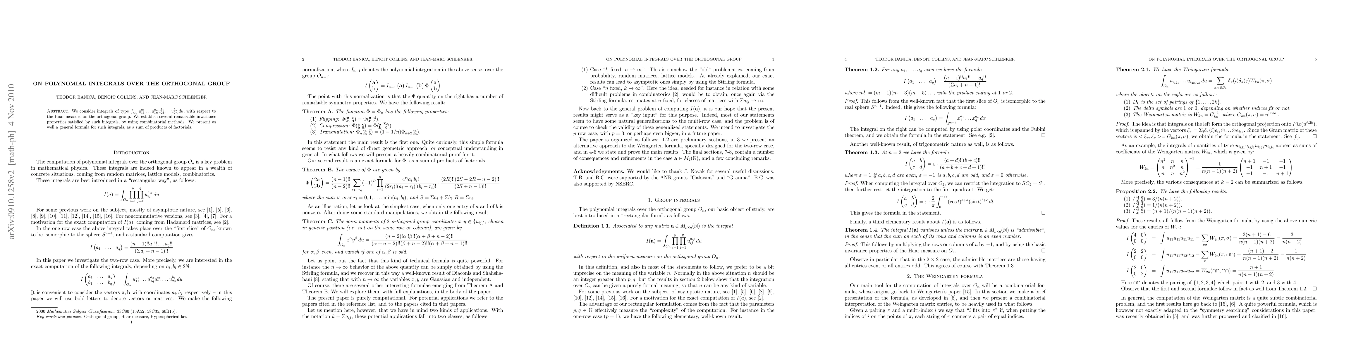 We consider integrals of type $\int_{O_n}u_{11}^{a_1}... u_{1n}^{a_n}u_{21}^{b_1}... u_{2n}^{b_n} du$, with respect to the Haar measure on the orthogonal group. We establish several remarkable invariance properties satisfied by such integrals, by using combinatorial methods. We present as well a general formula for such integrals, as a sum of products of factorials.