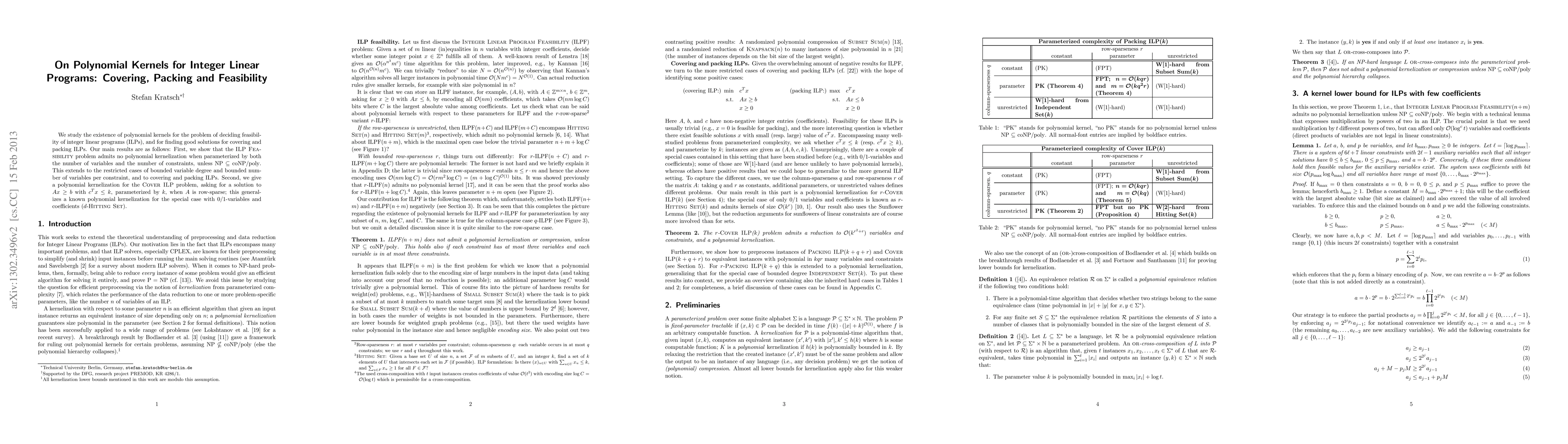 **Summary:** This paper investigates the kernelization possibilities for integer linear programs (ILPs) focusing on feasibility, covering, and packing problems. It proves that ILP feasibility cannot be polynomially kernelized under certain parameters unless NP collapses to coNP/poly. It also presents a polynomial kernelization for a row-sparse Cover ILP problem.