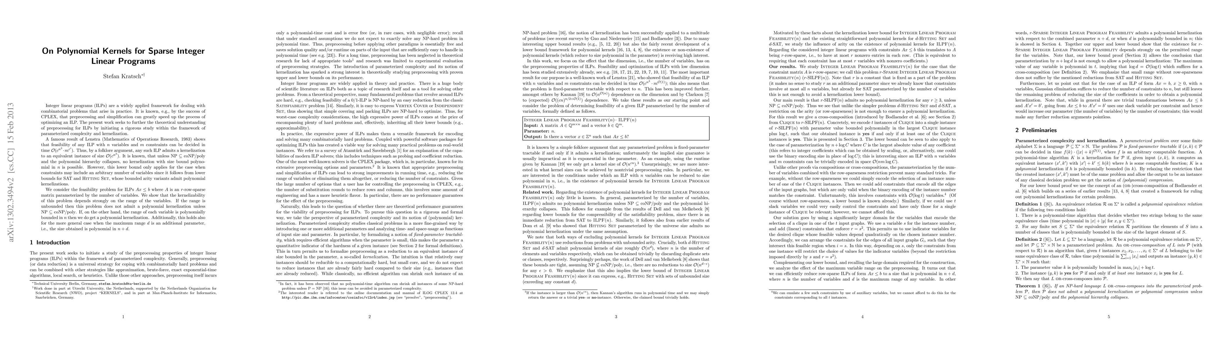 Integer linear programs (ILPs) are a widely applied framework for dealing with combinatorial problems that arise in practice. It is known, e.g., by the success of CPLEX, that preprocessing and simplification can greatly speed up the process of optimizing an ILP. The present work seeks to further the theoretical understanding of preprocessing for ILPs by initiating a rigorous study within the framework of parameterized complexity and kernelization. A famous result of Lenstra (Mathematics of Operations Research, 1983) shows that feasibility of any ILP with n variables and m constraints can be decided in time O(c^{n^3} m^c'). Thus, by a folklore argument, any such ILP admits a kernelization to an equivalent instance of size O(c^{n^3}). It is known, that unless NP \subseteq coNP/poly and the polynomial hierarchy collapses, no kernelization with size bound polynomial in n is possible. However, this lower bound only applies for the case when constraints may include an arbitrary number of variables since it follows from lower bounds for Satisfiability and Hitting Set, whose bounded arity variants admit polynomial kernelizations. We consider the feasibility problem for ILPs Ax<= b where A is an r-row-sparse matrix parameterized by the number of variables. We show that the kernelizability of this problem depends strongly on the range of the variables. If the range is unbounded then this problem does not admit a polynomial kernelization unless NP \subseteq coNP/poly. If, on the other hand, the range of each variable is polynomially bounded in n then we do get a polynomial kernelization. Additionally, this holds also for the more general case when the maximum range d is an additional parameter, i.e., the size obtained is polynomial in n+d.