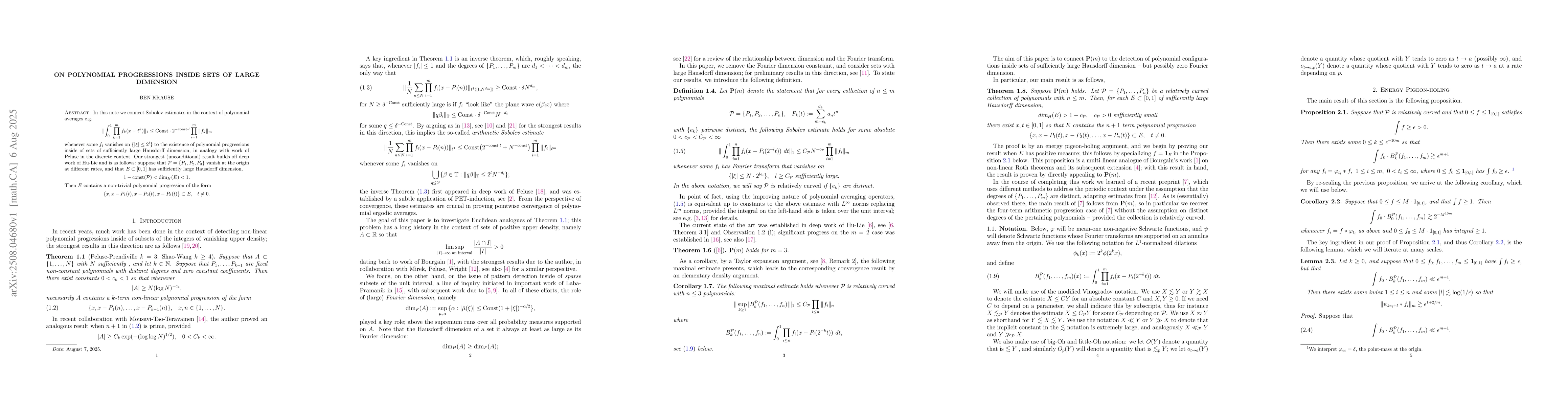 In this note we connect Sobolev estimates in the context of polynomial averages e.g. \[ \| \int_0^1 \prod_{k=1}^m f_k(x-t^k) \|_{1} \leq \text{Const} \cdot 2^{-\text{const} \cdot l} \prod_{i=1}^m \| f_k \|_m \] whenever some $f_i$ vanishes on $\{ |\xi| \leq 2^l \}$ to the existence of polynomial progressions inside of sets of sufficiently large Hausdorff dimension, in analogy with work of Peluse in the discrete context. Our strongest (unconditional) result builds off deep work of Hu-Lie is as follows: suppose that $\mathcal{P} = \{P_1,P_2,P_3\}$ vanish at the origin at different rates, and that $E \subset [0,1]$ has sufficiently large Hausdorff dimension, \[ 1 - \text{const}(\mathcal{P}) < \text{dim}_H(E) < 1.\] Then $E$ contains a non-trivial polynomial progression of the form \[ \{ x , x - P_1(t), x - P_2(t), x - P_3(t) \} \subset E, \; \; \; t \neq 0. \]