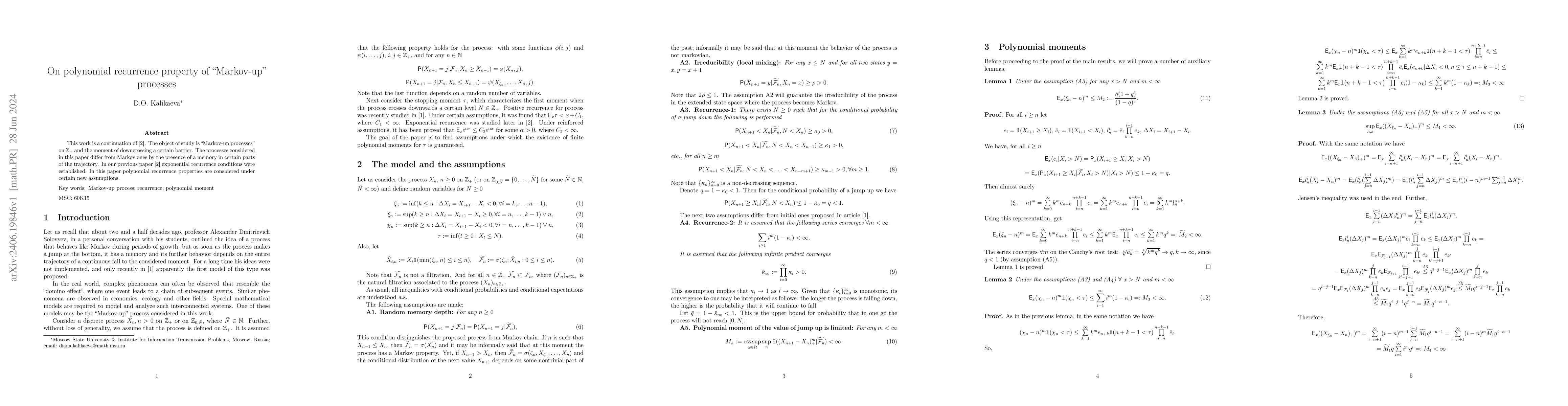 This paper investigates "Markov-up processes" on the positive integers, focusing on the recurrence properties when downcrossing a barrier. Unlike traditional Markov processes, these have memory effects. It builds on prior work establishing exponential recurrence, now examining polynomial recurrence under new assumptions.