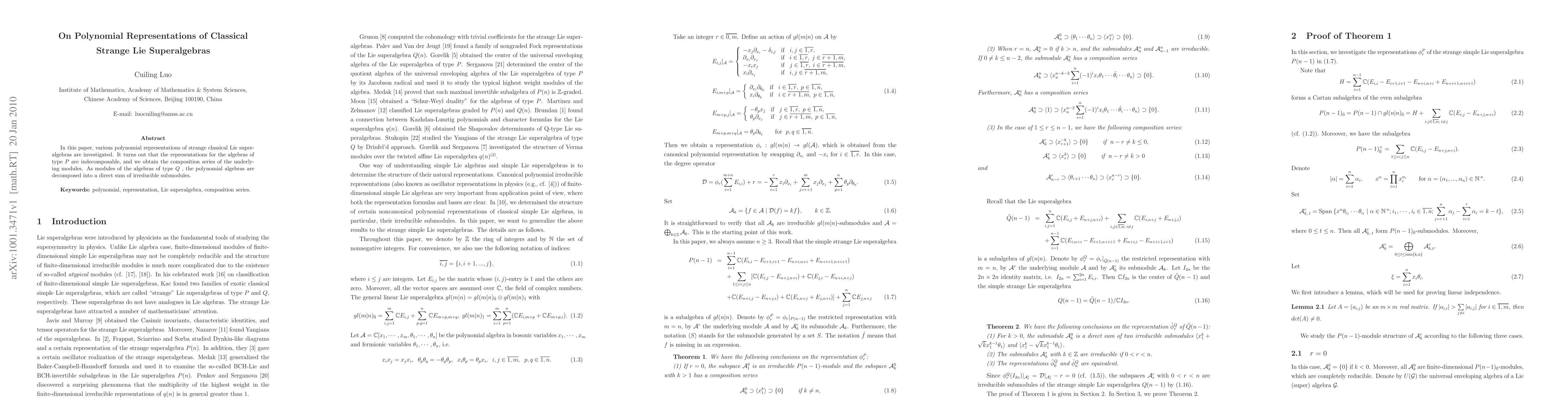 This paper investigates polynomial representations of classical strange Lie superalgebras, finding that type P representations are indecomposable with determined composition series, while type Q representations decompose into irreducible submodules.