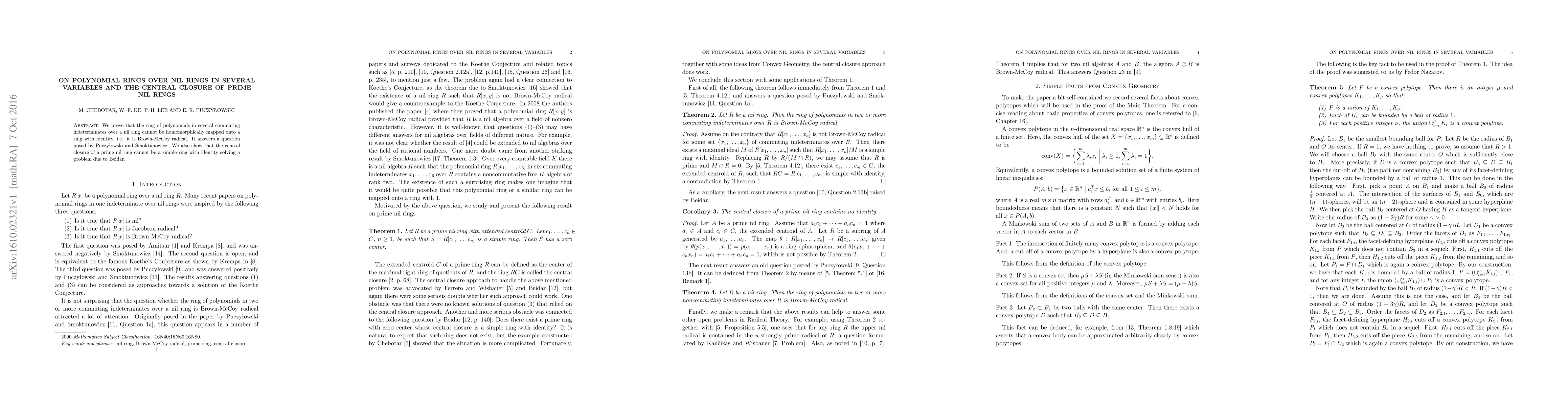 Summary: This paper demonstrates that polynomial rings over nil rings in several variables are Brown-McCoy radical, meaning they cannot be homomorphically mapped onto a ring with identity. It also resolves a question by proving that the central closure of a prime nil ring cannot be a simple ring with identity.