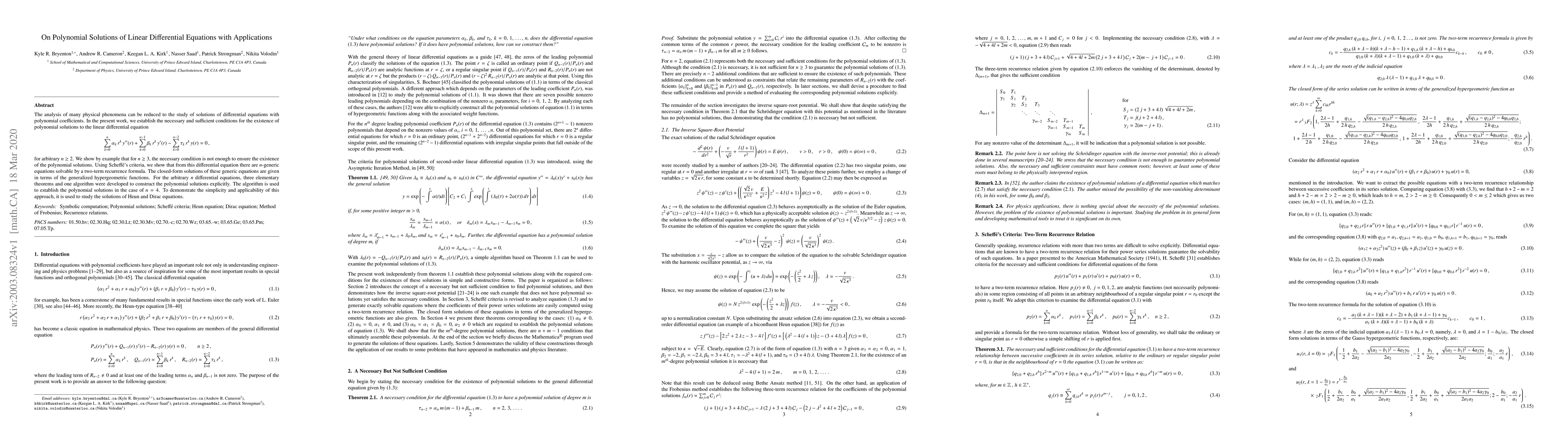 This paper establishes necessary and sufficient conditions for polynomial solutions to linear differential equations with polynomial coefficients, showing that for $n \ge 3$, the necessary conditions alone are insufficient. It develops an algorithm for constructing polynomial solutions and applies it to Heun and Dirac equations to demonstrate its applicability.