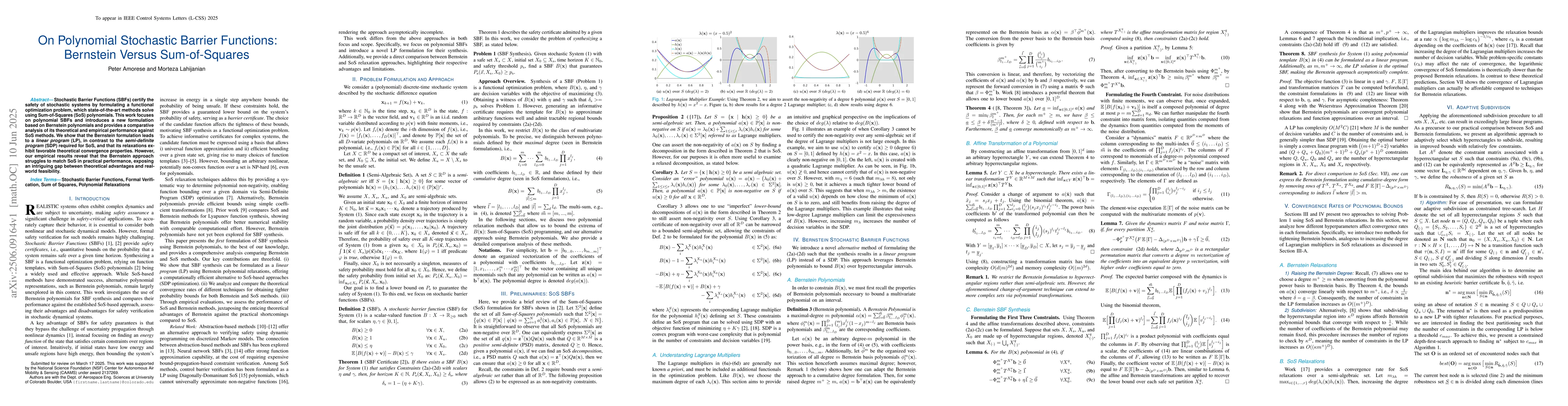 This paper compares two methods for formulating stochastic barrier functions: Bernstein polynomials and Sum-of-Squares polynomials. While the Bernstein approach offers theoretical advantages, its practical performance falls short of that of SoS.