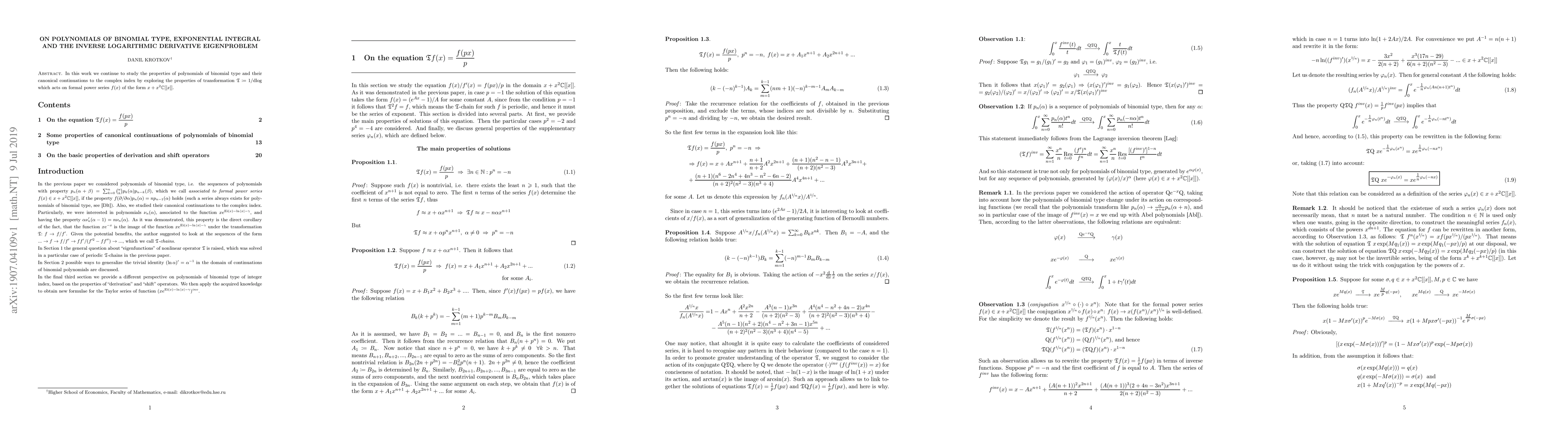 In this work we continue to study the properties of polynomials of binomial type and their canonical continuations to the complex index by exploring the properties of transformation T:=1/dlog which acts on formal power series $f(x)$ of the form $x+x^2\mathbb{C}[[x]]$.