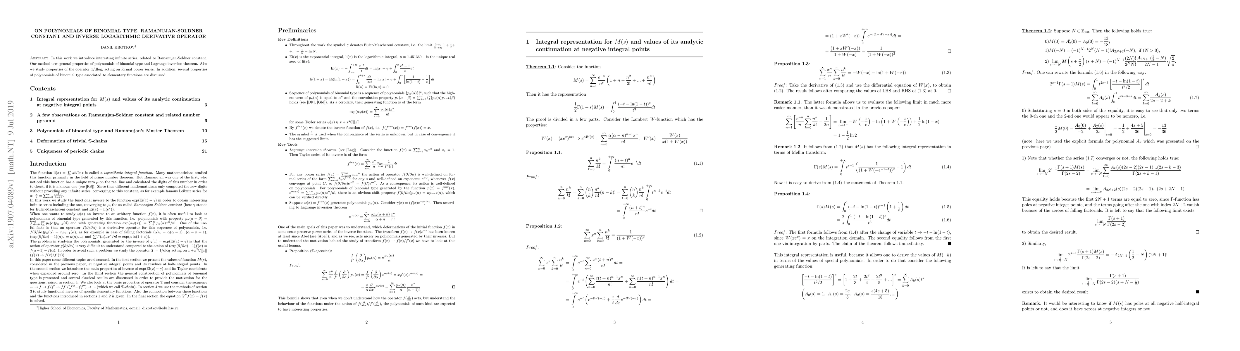 In this work we introduce interesting infinite series, related to Ramanujan-Soldner constant. Our method uses general properties of polynomials of binomial type and Lagrange inversion theorem. Also we study properties of the operator 1/dlog, acting on formal power series. In addition, several properties of polynomials of binomial type associated to elementary functions are discussed.