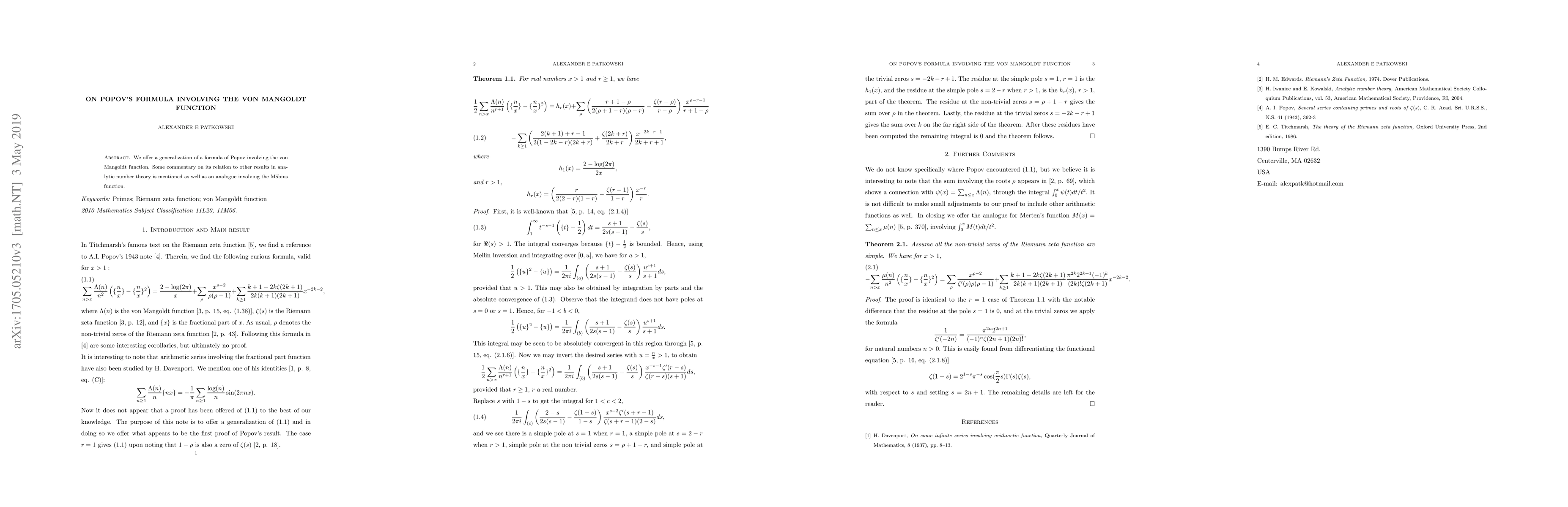 Two-line summary: This paper generalizes Popov's formula related to the Von Mangoldt function and discusses its connections to other analytic number theory results, also presenting an analogue involving the Möbius function. The generalization aims to expand the understanding of these significant number-theoretic functions.