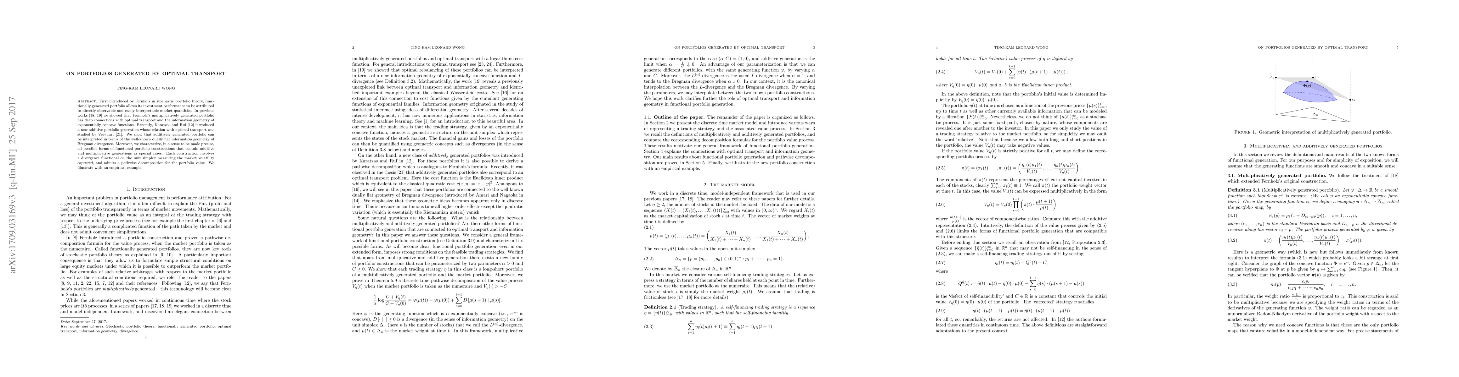 First introduced by Fernholz in stochastic portfolio theory, functionally generated portfolio allows its investment performance to be attributed to directly observable and easily interpretable market quantities. In previous works we showed that Fernholz's multiplicatively generated portfolio has deep connections with optimal transport and the information geometry of exponentially concave functions. Recently, Karatzas and Ruf introduced a new additive portfolio generation whose relation with optimal transport was studied by Vervuurt. We show that additively generated portfolio can be interpreted in terms of the well-known dually flat information geometry of Bregman divergence. Moreover, we characterize, in a sense to be made precise, all possible forms of functional portfolio constructions that contain additive and multiplicative generations as special cases. Each construction involves a divergence functional on the unit simplex measuring the market volatility captured, and admits a pathwise decomposition for the portfolio value. We illustrate with an empirical example.