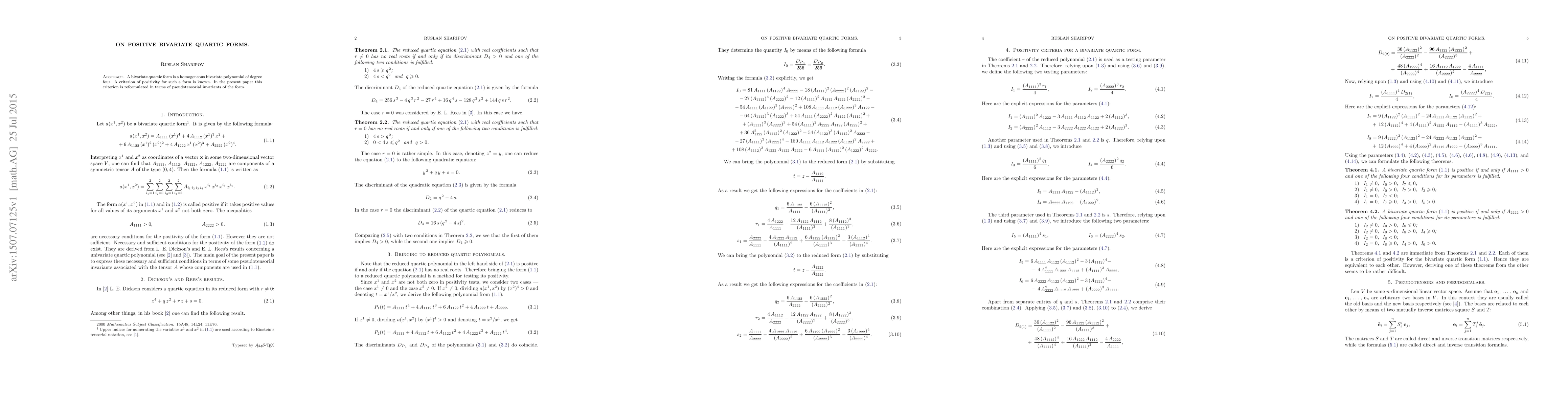 A bivariate quartic form is a homogeneous bivariate polynomial of degree four. A criterion of positivity for such a form is known. In the present paper this criterion is reformulated in terms of pseudotensorial invariants of the form.