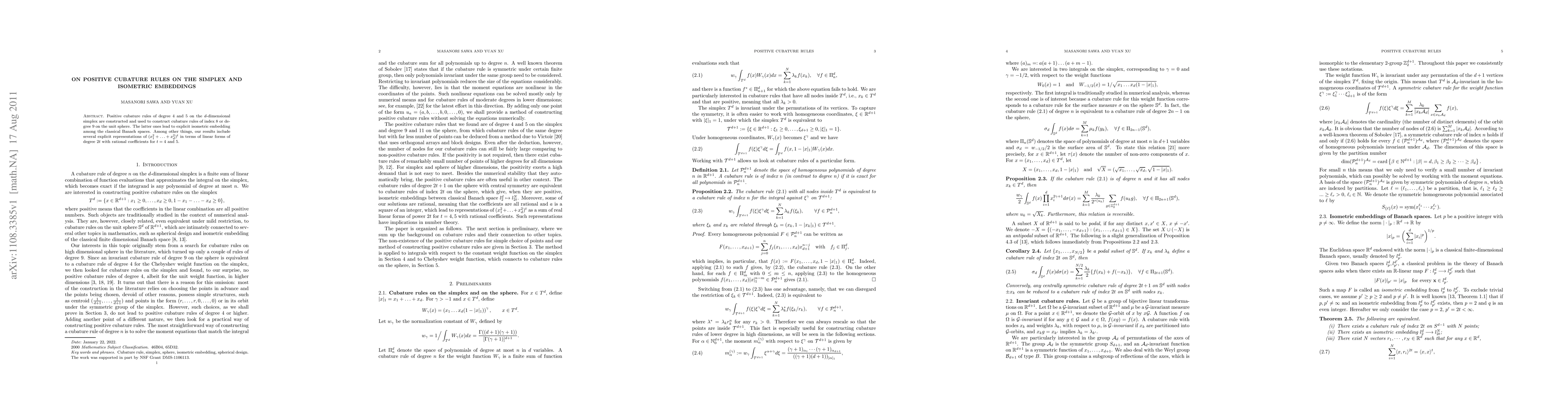 This paper constructs positive cubature rules for the $d$-dimensional simplex and uses them to derive cubature rules on the unit sphere, leading to explicit isometric embeddings among classical Banach spaces. It also provides explicit representations of quadratic forms in terms of linear forms for degrees 4 and 5.