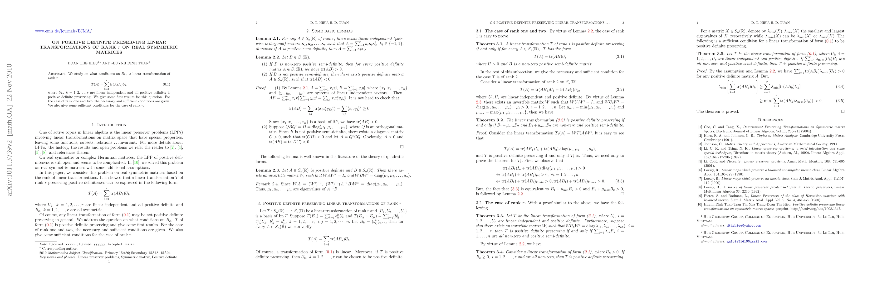 This paper investigates the conditions under which the linear transformation \( T(A) = \sum_{k=1}^r \text{tr}(AB_k)U_k \) preserves positive definiteness for real symmetric matrices \( A \), where \( U_k \) are positive definite and linearly independent. It provides necessary and sufficient conditions for rank one and two transformations, and sufficient conditions for general rank \( r \).