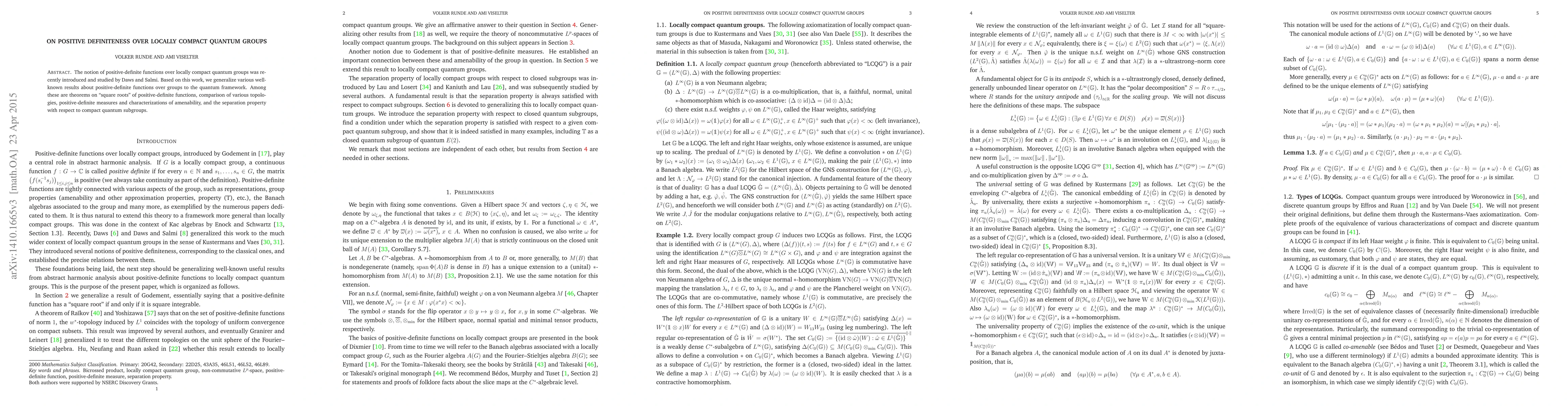 This paper generalizes classical results on positive-definite functions from groups to locally compact quantum groups, including theorems on "square roots," comparisons of topologies, and characterizations of amenability, along with the separation property concerning compact quantum subgroups.