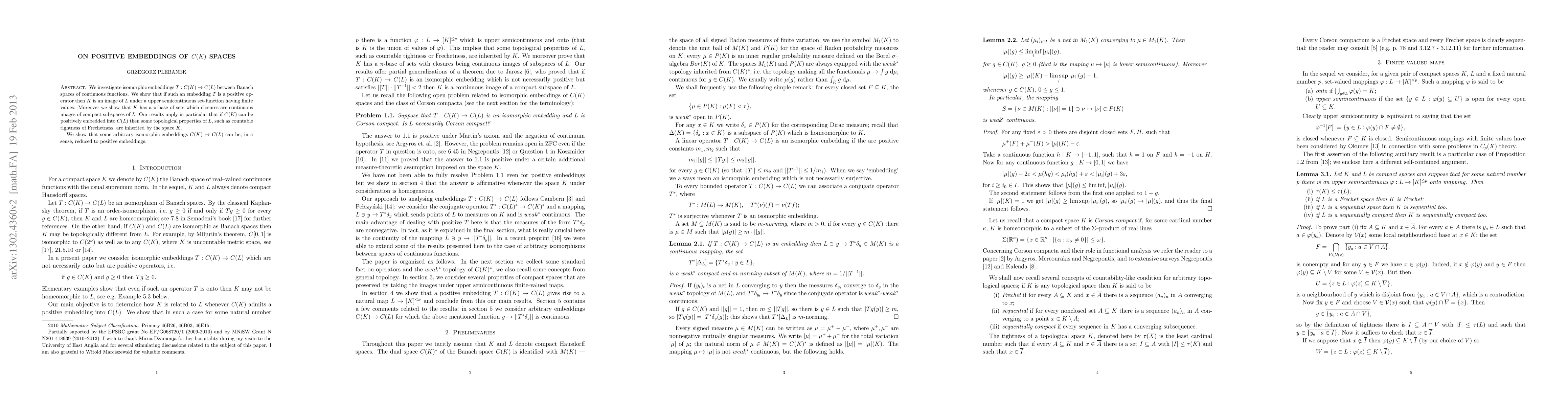This paper explores positive embeddings of Banach spaces of continuous functions, proving that a positive embedding implies $K$ is an image of $L$ under a specific set-function. It also shows that $K$ possesses a $\pi$-base and that certain topological properties of $L$ transfer to $K$.