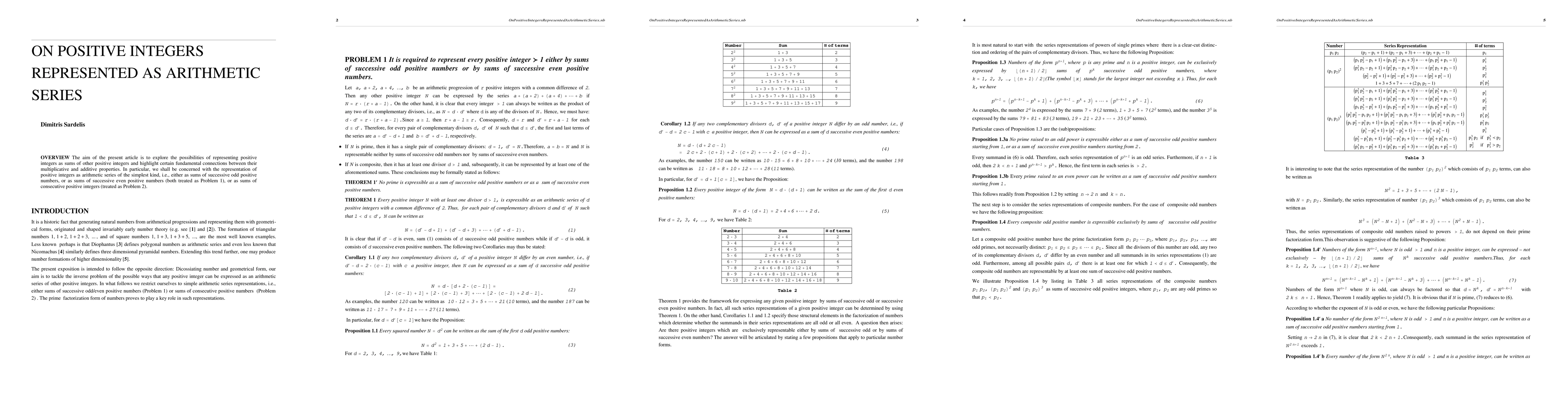 The aim of the present article is to explore the possibilities of representing positive integers as sums of other positive integers and highlight certain fundamental connections between their multiplicative and additive properties. In particular, we shall be concerned with the representation of positive integers as arithmetic series of the simplest kind, i.e., either as sums of successive odd positive numbers, or as sums of successive even positive numbers (both treated as Problem 1), or as sums of consecutive positive integers (treated as Problem 2).