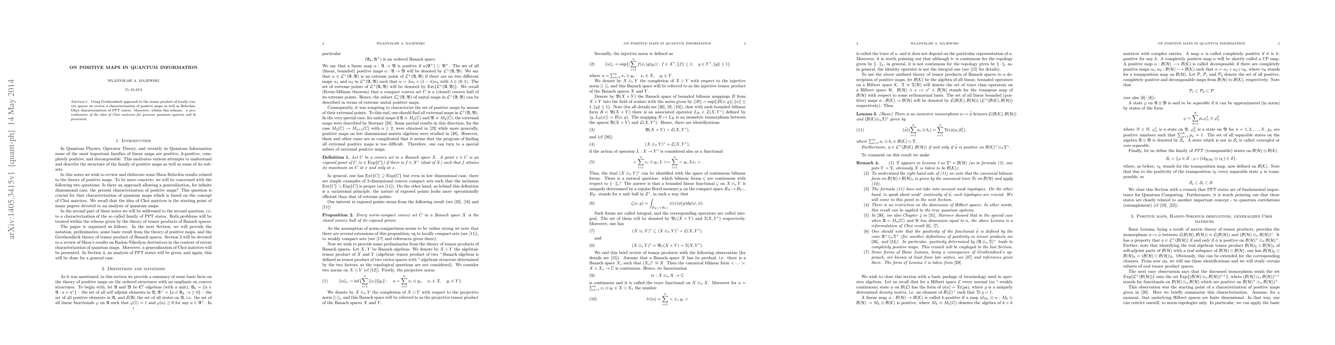 Using Grothendieck approach to the tensor product of locally convex spaces we review a characterization of positive maps as well as Belavkin-Ohya characterization of PPT states. Moreover, within this scheme, \textit{ a generalization of the idea of Choi matrices for genuine quantum systems will be presented}.