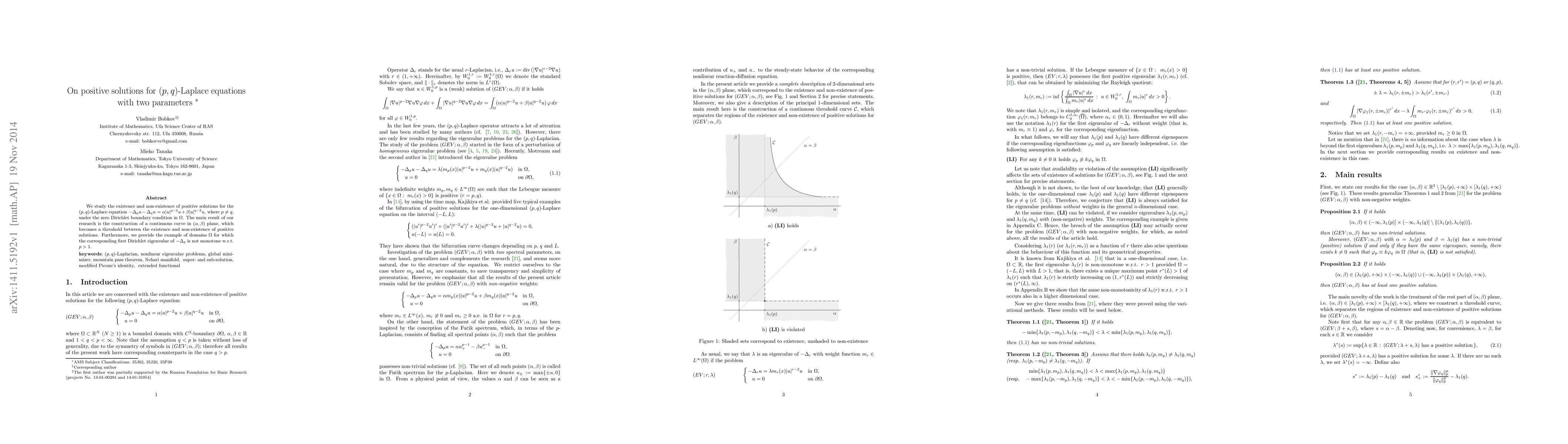 This paper investigates the existence and non-existence of positive solutions for the $(p,q)$-Laplace equation under zero Dirichlet boundary conditions, establishing a continuous threshold curve in the $(\alpha,\beta)$ plane. It also presents examples of domains where the first Dirichlet eigenvalue of $-\Delta_p$ is non-monotonic with respect to $p > 1$.