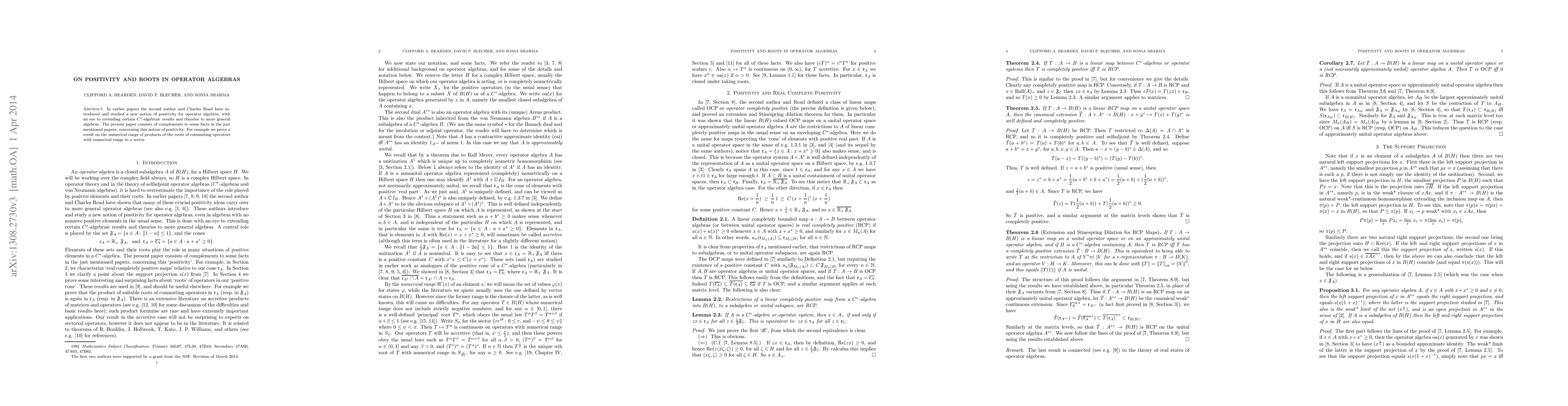 In earlier papers the second author and Charles Read have introduced and studied a new notion of positivity for operator algebras, with an eye to extending certain C*-algebraic results and theories to more general algebras. The present paper consists of complements to some facts in the just mentioned papers, concerning this notion of positivity. For example we prove a result on the numerical range of products of the roots of commuting operators with numerical range in a sector.