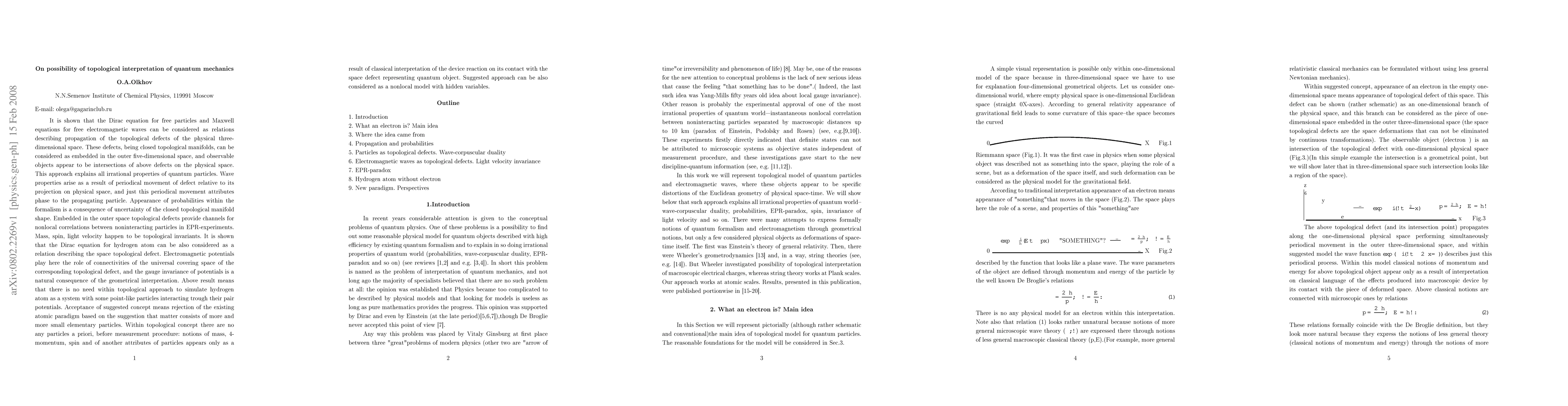 This paper proposes a topological interpretation of quantum mechanics, suggesting that quantum objects can be modeled geometrically as space topological defects. It demonstrates that the Dirac and Maxwell equations describe the behavior of these defects, explaining quantum phenomena like wave-particle duality and nonlocal correlations.