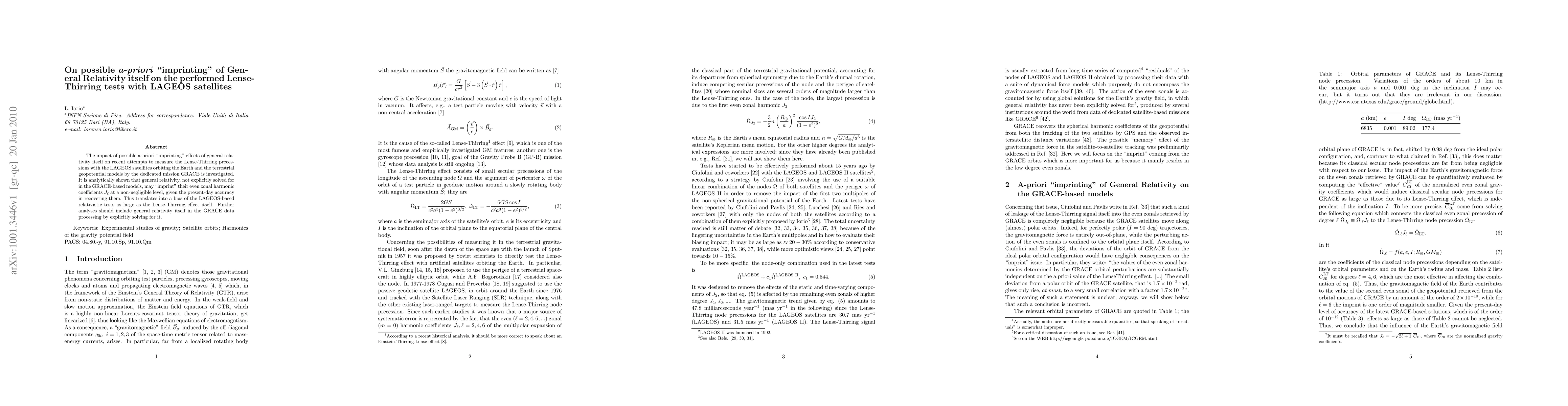 This paper investigates how general relativity might "imprint" on measurements of Lense-Thirring precessions using LAGEOS satellites, suggesting that the GRACE-based models may be biased due to this effect. The study concludes that general relativity should be explicitly solved for in GRACE data processing to avoid significant biases in relativistic tests.