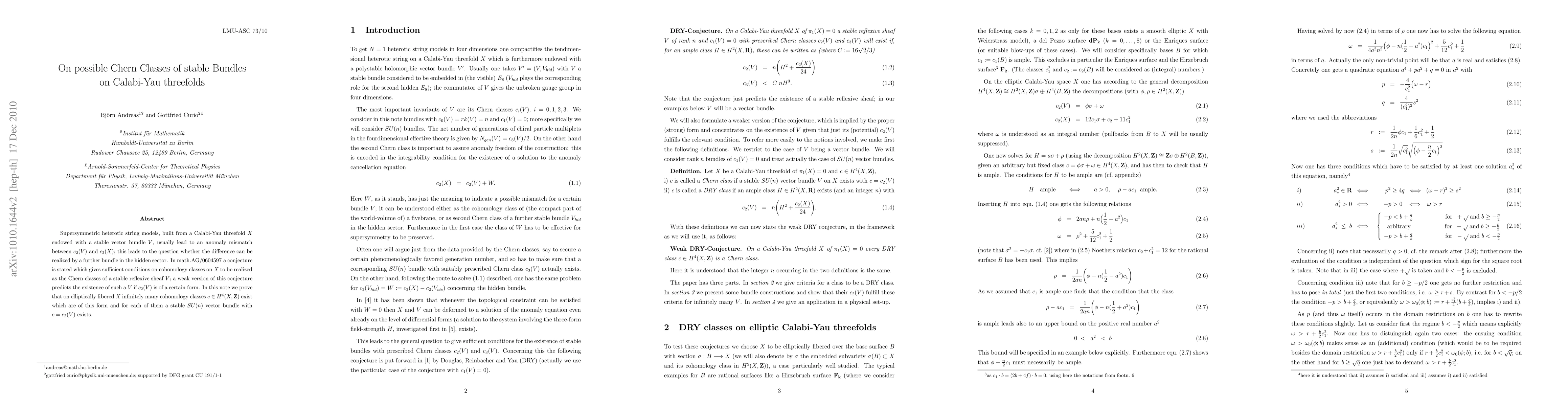 Supersymmetric heterotic string models, built from a Calabi-Yau threefold $X$ endowed with a stable vector bundle $V$, usually lead to an anomaly mismatch between $c_2(V)$ and $c_2(X)$; this leads to the question whether the difference can be realized by a further bundle in the hidden sector. In math.AG/0604597 a conjecture is stated which gives sufficient conditions on cohomology classes on $X$ to be realized as the Chern classes of a stable reflexive sheaf $V$; a weak version of this conjecture predicts the existence of such a $V$ if $c_2(V)$ is of a certain form. In this note we prove that on elliptically fibered $X$ infinitely many cohomology classes $c\in H^4(X, {\bf Z})$ exist which are of this form and for each of them a stable SU(n) vector bundle with $c=c_2(V)$ exists.